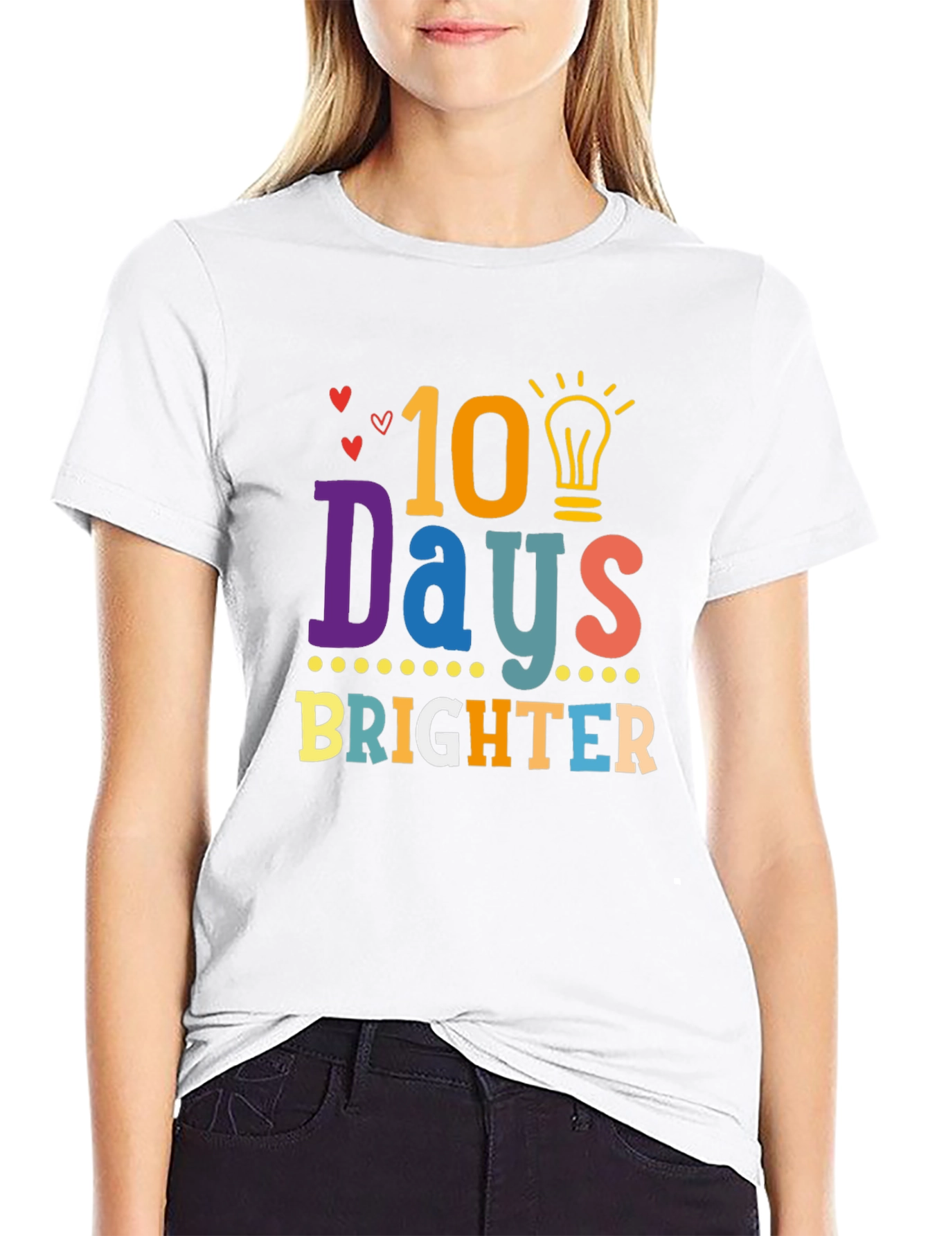 Celebrate 100 days of school with this cheerful black t-shirt. The shirt features a vibrant design with the words "100 Days Brighter" in a playful mix of colorful fonts, including an eye-catching lightbulb graphic. The design is perfect for teachers and students. Made from comfortable materials, this t-shirt offers both style and comfort, ideal for everyday wear. This t-shirt is a perfect choice for marking this special milestone with fun and flair.