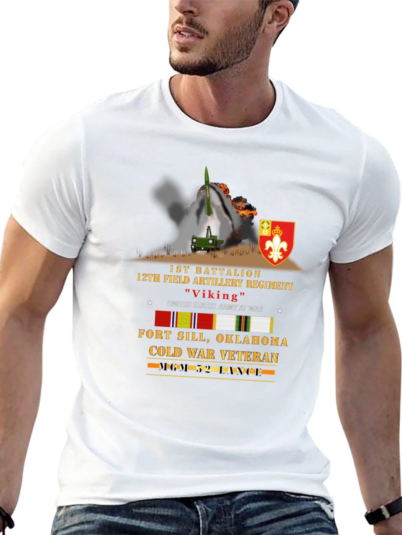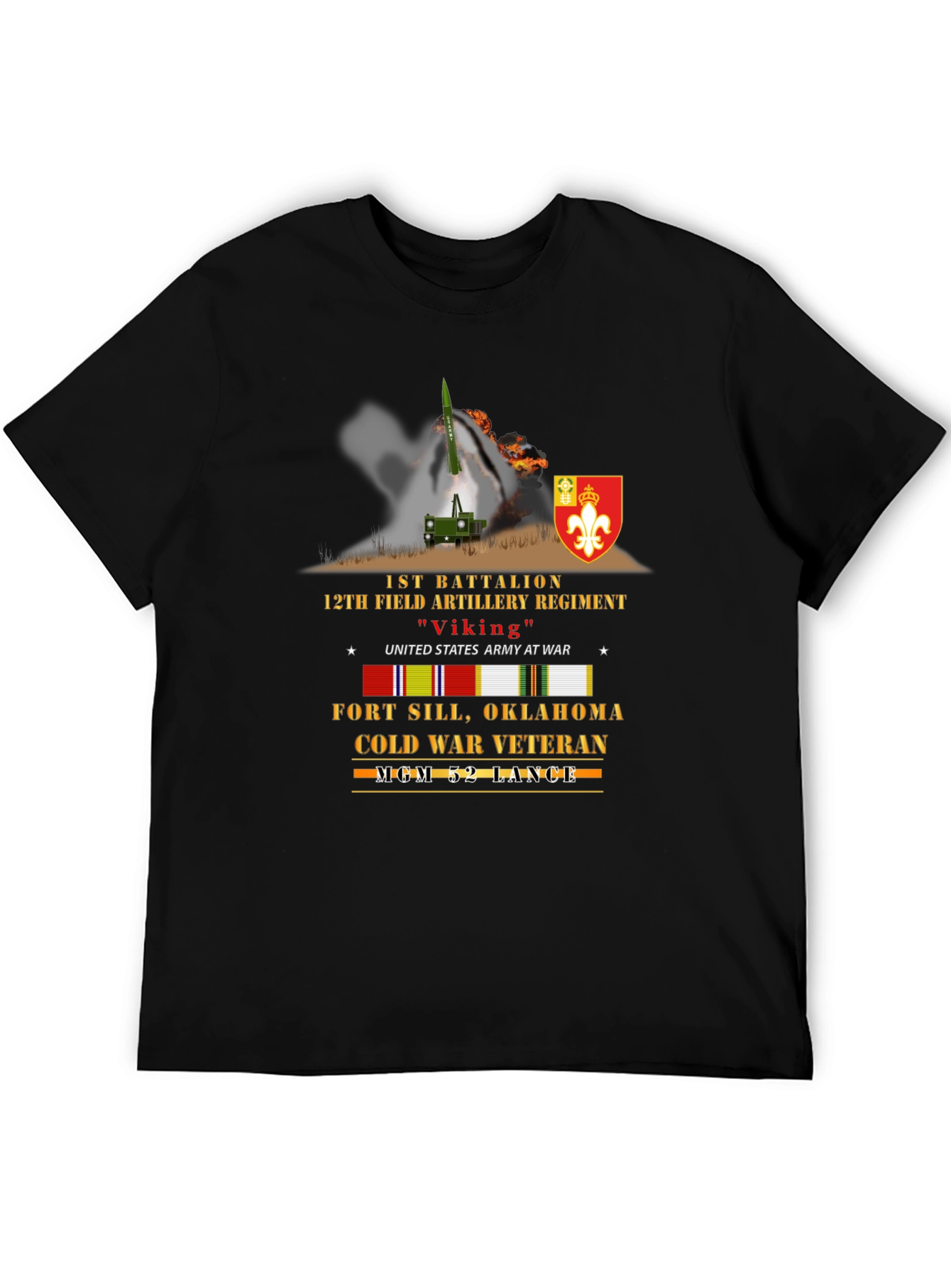 Show your pride with this striking black t-shirt featuring a bold design commemorating the 1st Battalion 12th Field Artillery Regiment, known as the "Viking." The shirt displays a vivid graphic depicting a rocket launch, alongside the unit's emblem, and honors Cold War veterans of Fort Sill, Oklahoma. The text "United States Army at War" is displayed under the emblem. Below is the text "MGM 52 LANCE", possibly referring to a specific weapon or operation. Ideal for veterans, military enthusiasts, or anyone wanting to show their support, this tee combines comfort and patriotism in a unique and memorable way.