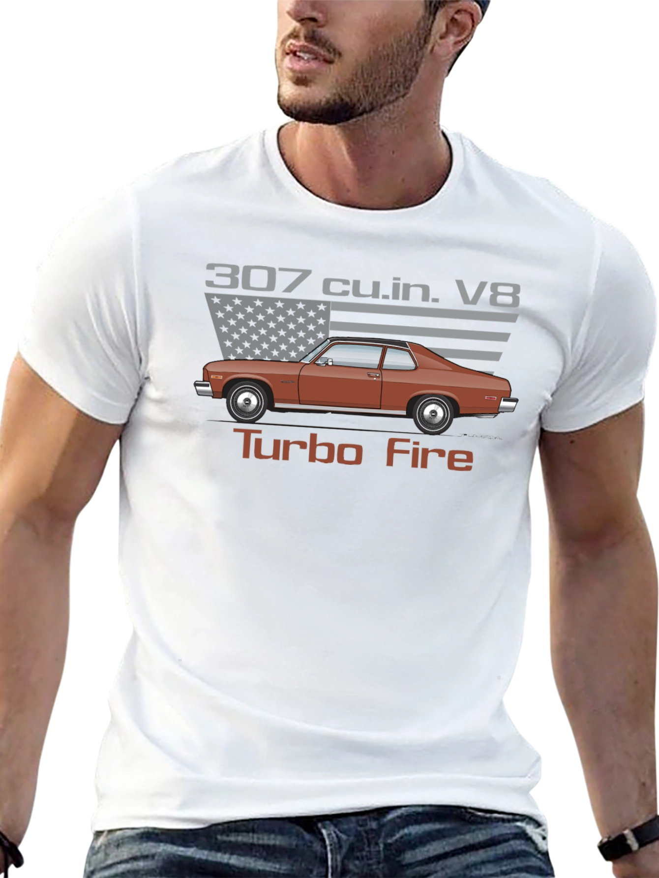 Show off your love for classic American muscle with this bold graphic tee. Featuring a vintage 307 cu.in. V8 Turbo Fire engine design with a classic coupe illustration over a stylized American flag backdrop, this black t-shirt is perfect for car enthusiasts and anyone who appreciates retro style. Made from a comfortable, breathable fabric, it’s ideal for everyday wear, car shows, or casual outings. This t-shirt is a statement piece that embodies the spirit of American automotive history. Get yours today and wear your passion with pride!