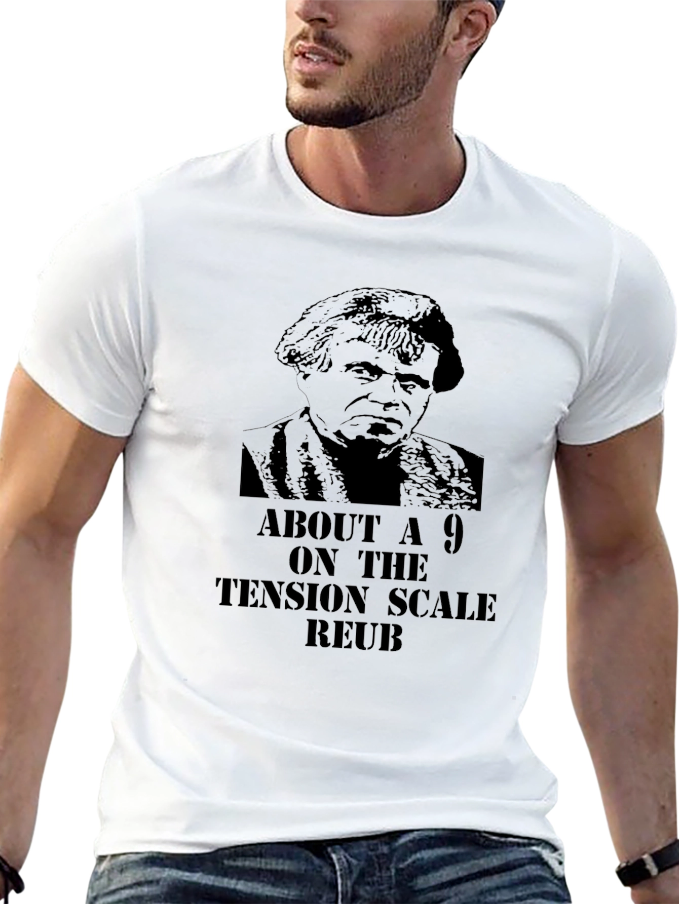 This black t-shirt features a unique and eye-catching design. It showcases a graphic image of a man with the text "ABOUT A 9 ON THE TENSION SCALE REUB". The design is printed in a contrasting color, making it stand out against the dark background. The shirt appears to be made from a comfortable, breathable fabric, ideal for everyday wear. Its classic fit makes it suitable for various body types, ensuring a relaxed and stylish look. Perfect for casual outings, movie nights, or as a conversation starter, this t-shirt is a must-have addition to any fan's wardrobe. Show off your personality with this distinctive and humorous piece!
