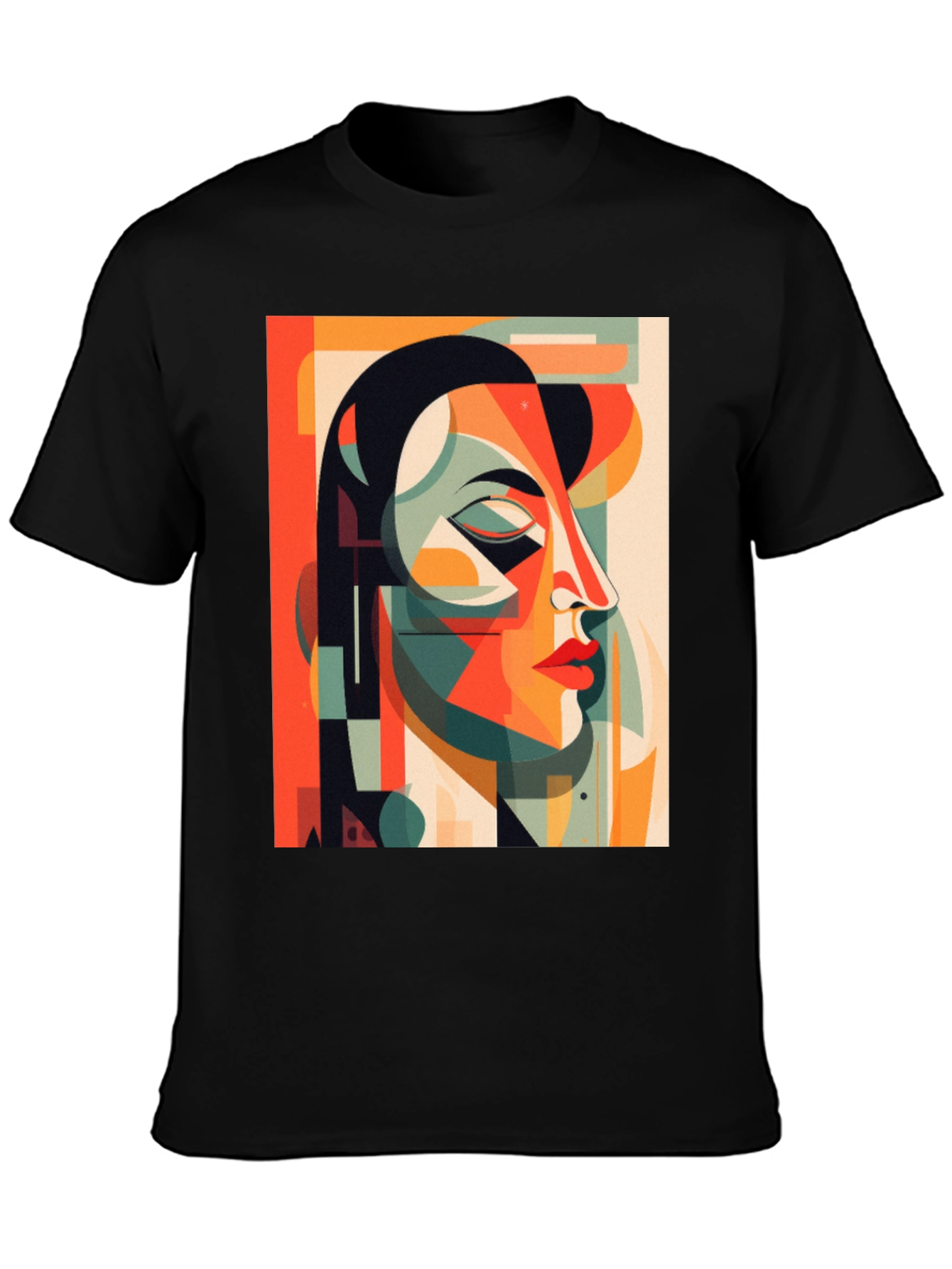 Showcase your artistic side with this striking graphic tee. Featuring a bold, abstract geometric face design in a vibrant palette of oranges, teals, and black, this shirt is a wearable piece of modern art. The eye-catching design is sure to turn heads and spark conversation. Made from a comfortable, breathable fabric, this tee is perfect for everyday wear, casual outings, or expressing your unique style. Pair it with jeans or shorts for a relaxed yet fashionable look. Elevate your wardrobe with this statement piece that blends contemporary art and everyday comfort.