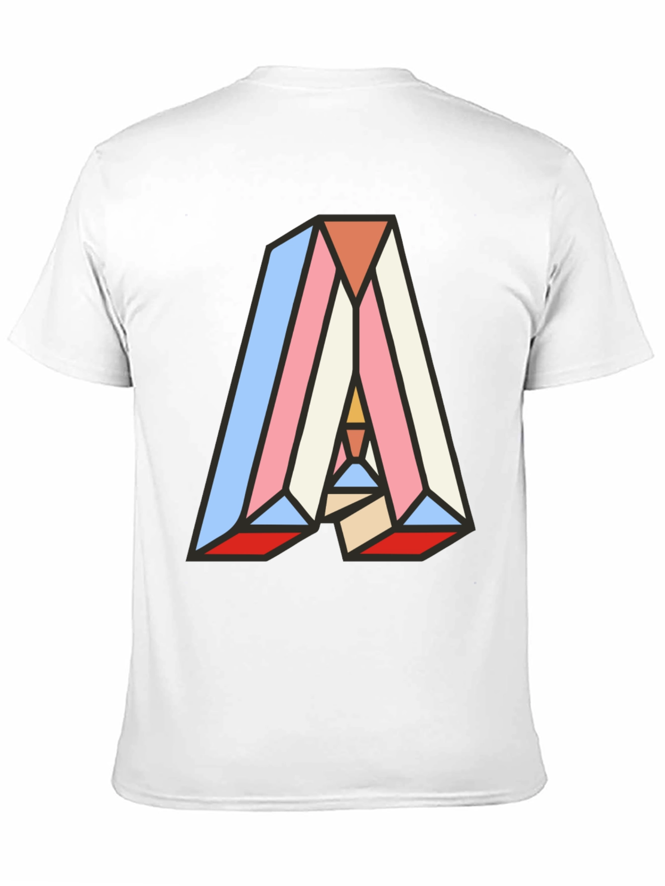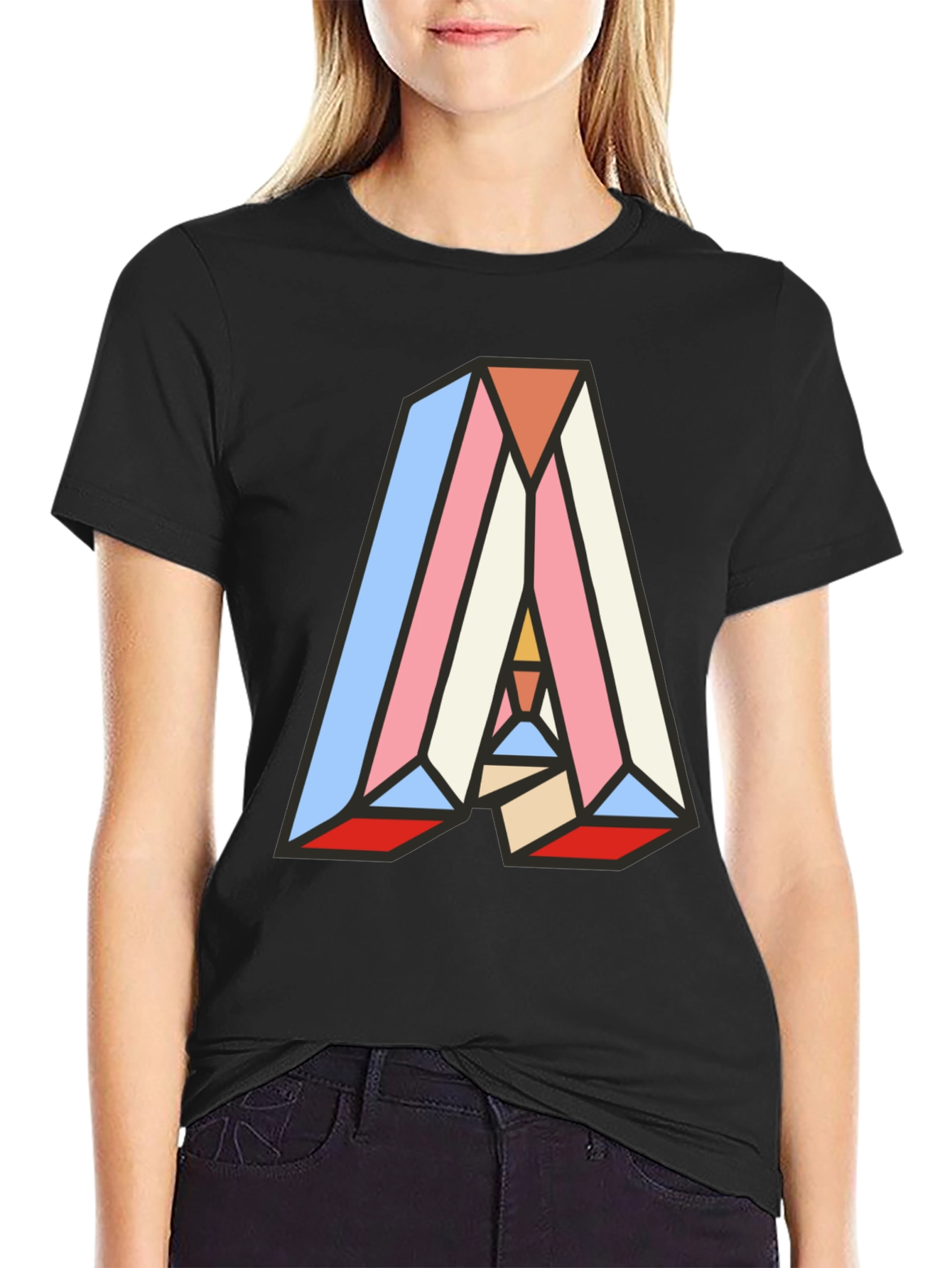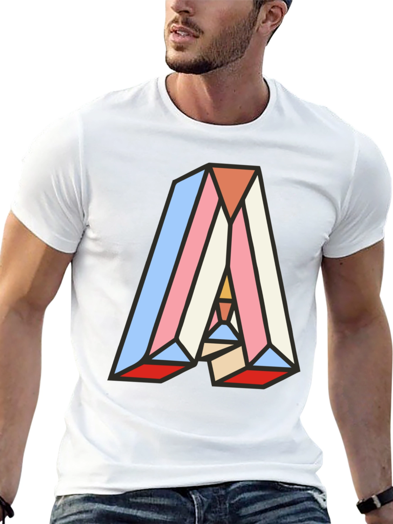 Make a bold statement with this eye-catching black t-shirt featuring an abstract, geometric design of the letter 'A'. The multi-colored print showcases a modern, artistic aesthetic with pastel shades. Constructed from a soft, comfortable fabric, this tee provides all-day wearability. Its regular fit makes it a versatile addition to any casual wardrobe. Pair it with jeans or shorts for an effortlessly cool look, perfect for expressing your unique style. This t-shirt is a conversation starter and a must-have for anyone who appreciates modern art and design.