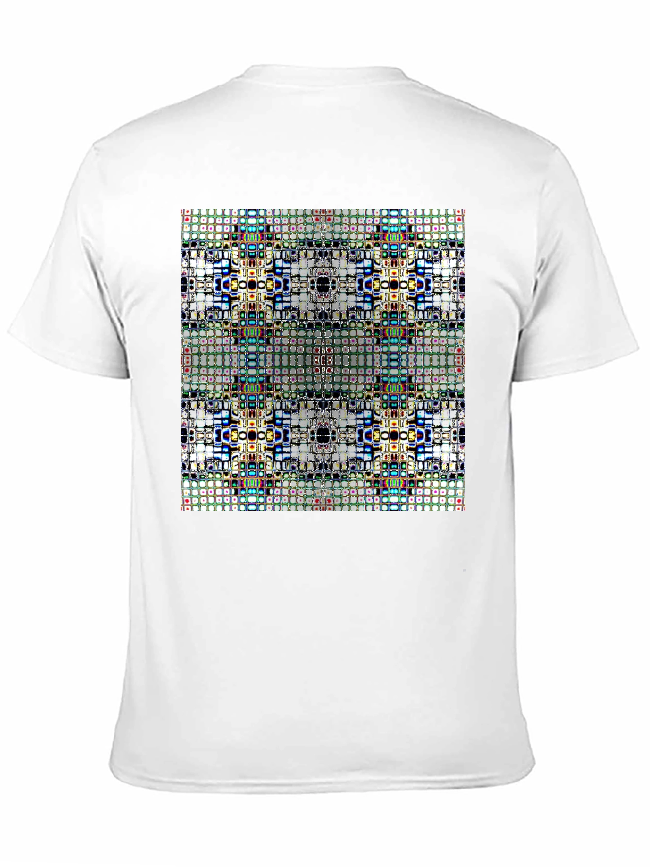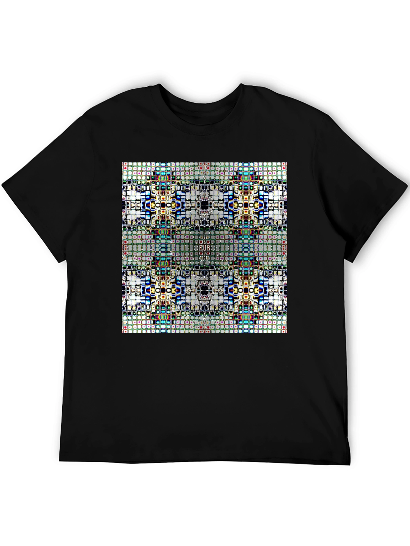 This eye-catching t-shirt features a unique abstract geometric pattern. The design consists of symmetrical tiled shapes in various colors, creating a visually intriguing and modern aesthetic. Made from a soft and breathable fabric, this t-shirt ensures all-day comfort. Its classic fit makes it suitable for various body types and styles. Perfect for casual wear, this t-shirt can be paired with jeans, shorts, or a skirt for a stylish look. Stand out from the crowd with this one-of-a-kind piece. The vibrant colors and captivating pattern are sure to make a statement wherever you go. A must-have addition to any fashion-forward wardrobe.