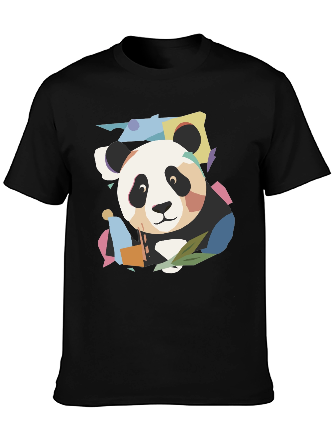 This stylish black t-shirt features a unique, abstract panda graphic design. The panda is depicted with a colorful, geometric style, creating a modern and eye-catching look. Made from a soft, comfortable fabric, this shirt is perfect for casual wear. The classic crew neck and short sleeves make it a versatile addition to any wardrobe. Pair it with jeans or shorts for a relaxed yet fashionable outfit. Show off your playful side with this fun and trendy tee!