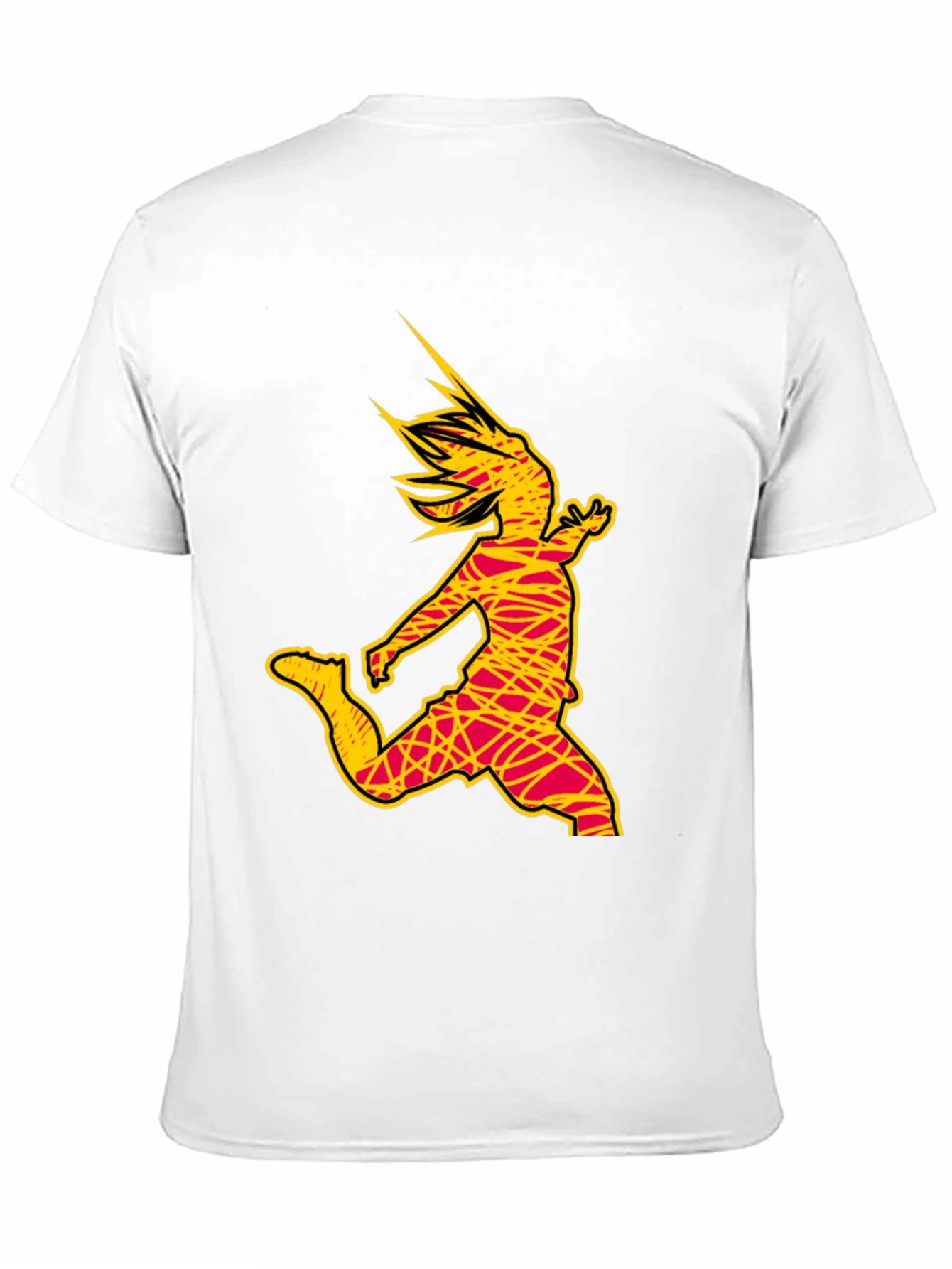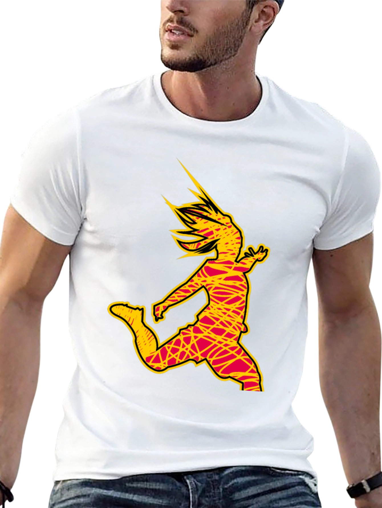 Showcase your unique style with this eye-catching black t-shirt. The shirt features a vibrant, abstract graphic of a soccer player in mid-kick. The design incorporates bold yellow and red lines, creating a dynamic and energetic visual. Made from a comfortable, breathable fabric, this tee is perfect for everyday wear, whether you're hitting the gym, hanging out with friends, or cheering on your favorite team. Express your love for sports and art with this standout piece. Its unique design will turn heads and make a statement wherever you go.