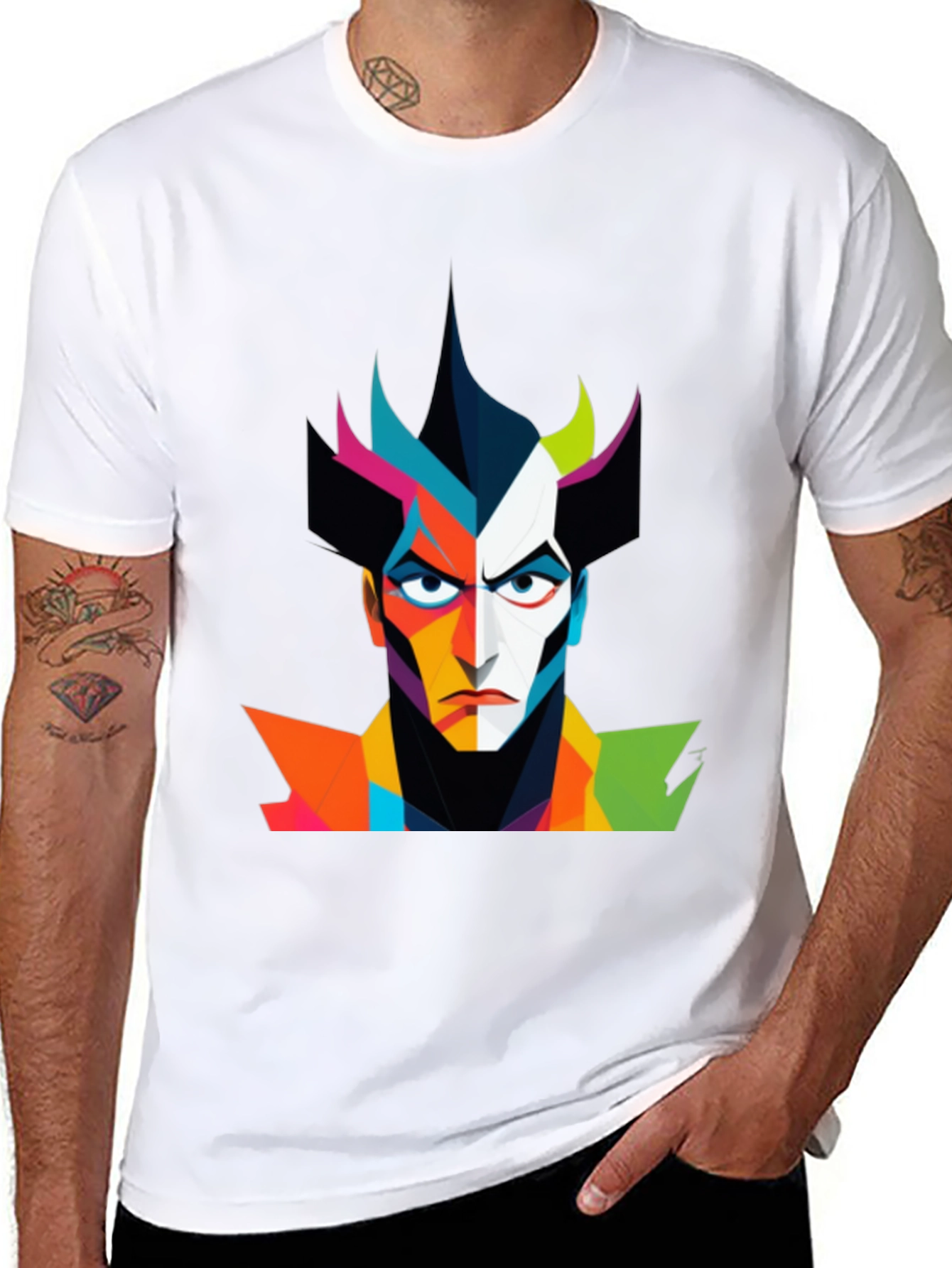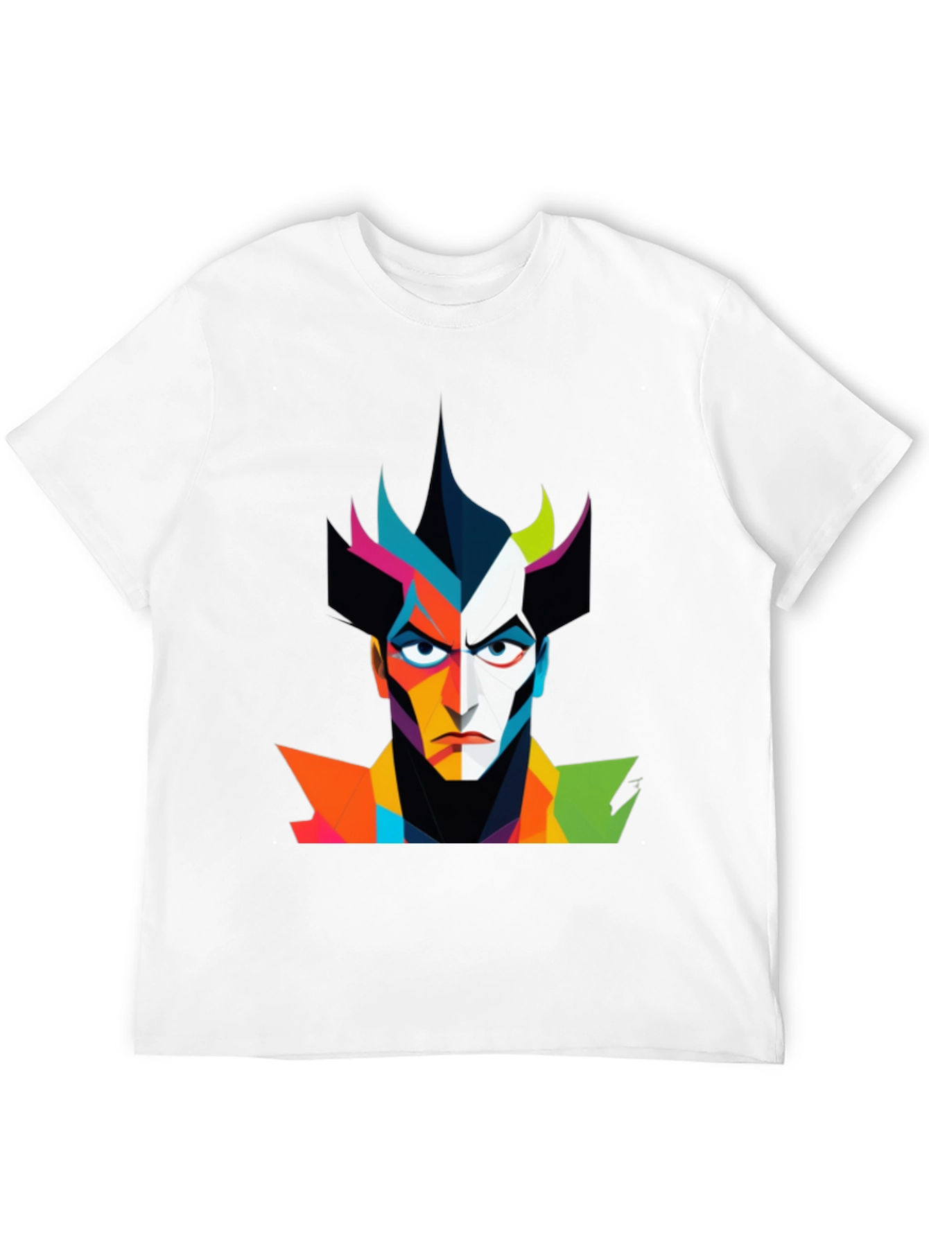 Make a bold statement with this unique black t-shirt featuring an eye-catching abstract graphic of a villainous character. The design incorporates a vibrant color palette, creating a striking visual effect. Crafted from a comfortable material, this tee is perfect for everyday wear. Show off your style and add a touch of artistic flair to your wardrobe. Ideal for casual outings, concerts, or expressing your unique personality. This striking tee will make a great gift for art lovers.