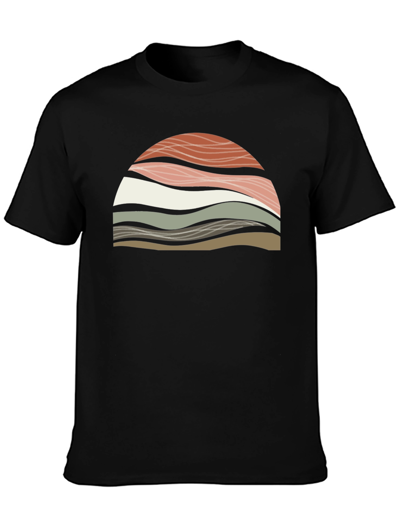 Show off your artistic side with this stylish black t-shirt. Featuring a unique, abstract graphic print in earthy hues, this tee is perfect for casual wear. The design showcases a semi-circle made of wavy lines in shades of brown, beige, and terracotta, giving off a modern, nature-inspired vibe. Made from a comfortable-looking fabric, this t-shirt provides a relaxed fit. Ideal for pairing with jeans or shorts, it's versatile enough for everyday outings, lounging at home, or meeting friends for coffee. Add a touch of contemporary art to your wardrobe!