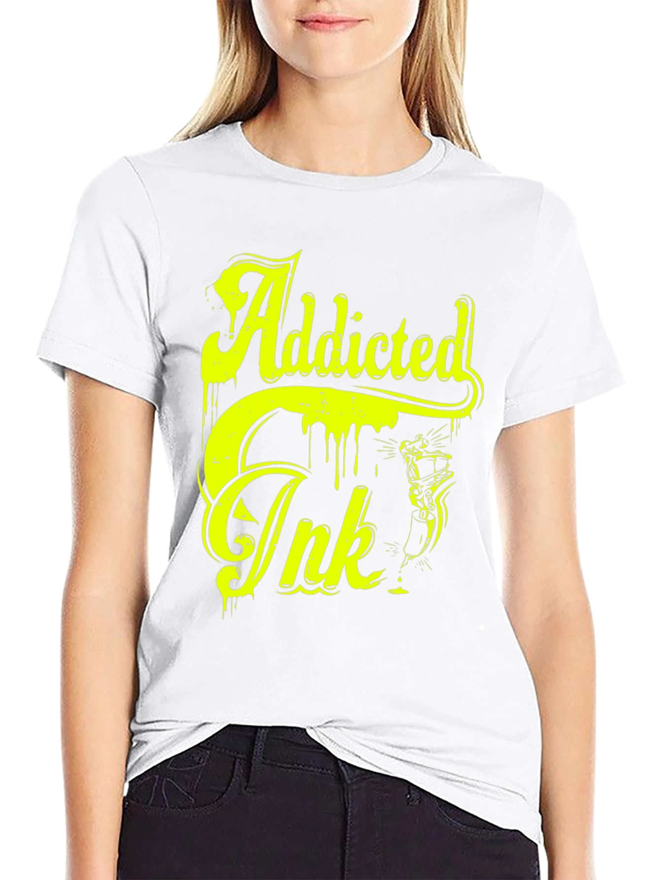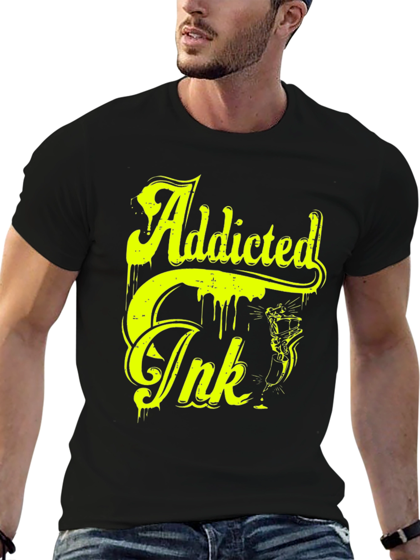Make a bold statement with this striking black t-shirt featuring a vibrant yellow "Addicted Ink" graphic design. The design has a dripping effect which provides a unique, edgy look. The shirt appears to be made from a comfortable cotton blend, perfect for everyday wear. Whether you're a tattoo enthusiast or just love eye-catching designs, this tee is a must-have addition to your wardrobe. Pair it with jeans for a casual look or dress it up with a jacket for a night out. The high-quality print ensures long-lasting vibrancy and durability, making it a timeless piece for any style.