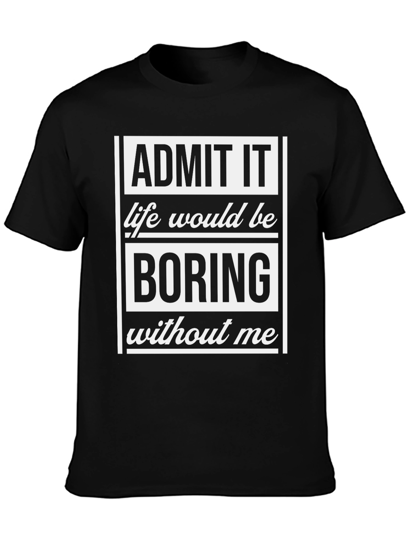 This black t-shirt makes a bold statement with its assertive graphic print. The design features the phrase "ADMIT IT life would be BORING without me" in a mix of block letters and script, creating a confident and playful message. Perfect for casual wear, this shirt is sure to turn heads and spark conversation. The comfortable fit and durable material make it a great addition to any wardrobe, whether you're going out with friends or just relaxing at home. Express your unique personality with this eye-catching tee!