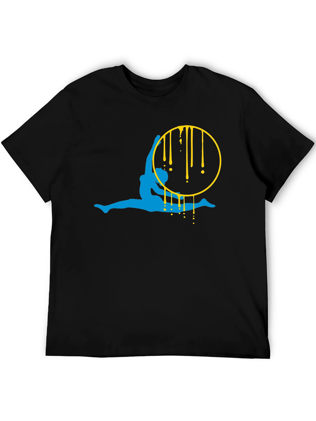 Show off your love for aerial arts with this unique black t-shirt! Featuring a vibrant blue silhouette of a gymnast performing a split inside a circle with dripping yellow paint accents, this tee is a stylish way to express your passion. The design is eye-catching and artistic, perfect for casual wear or a trip to the gym. Made from comfortable, breathable material, this t-shirt ensures a great fit and lasting comfort. Get yours today and stand out from the crowd!