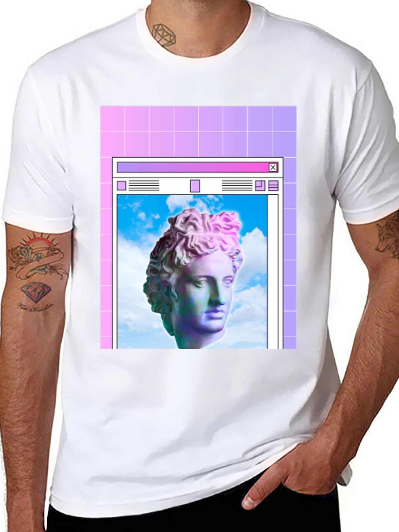 Step into a realm of retro-futurism with this unique t-shirt. The black cotton tee features a vibrant, eye-catching vaporwave design. A classic marble statue bust is artfully displayed within a pastel-colored, retro computer window graphic. The nostalgic color palette of purples and pinks gives a retro vibe. Made from comfortable, breathable fabric, this shirt is perfect for everyday wear or a night out. Pair it with jeans for a casual look, or dress it up with a blazer for a more edgy style. Express your individuality and make a statement with this one-of-a-kind vaporwave t-shirt!