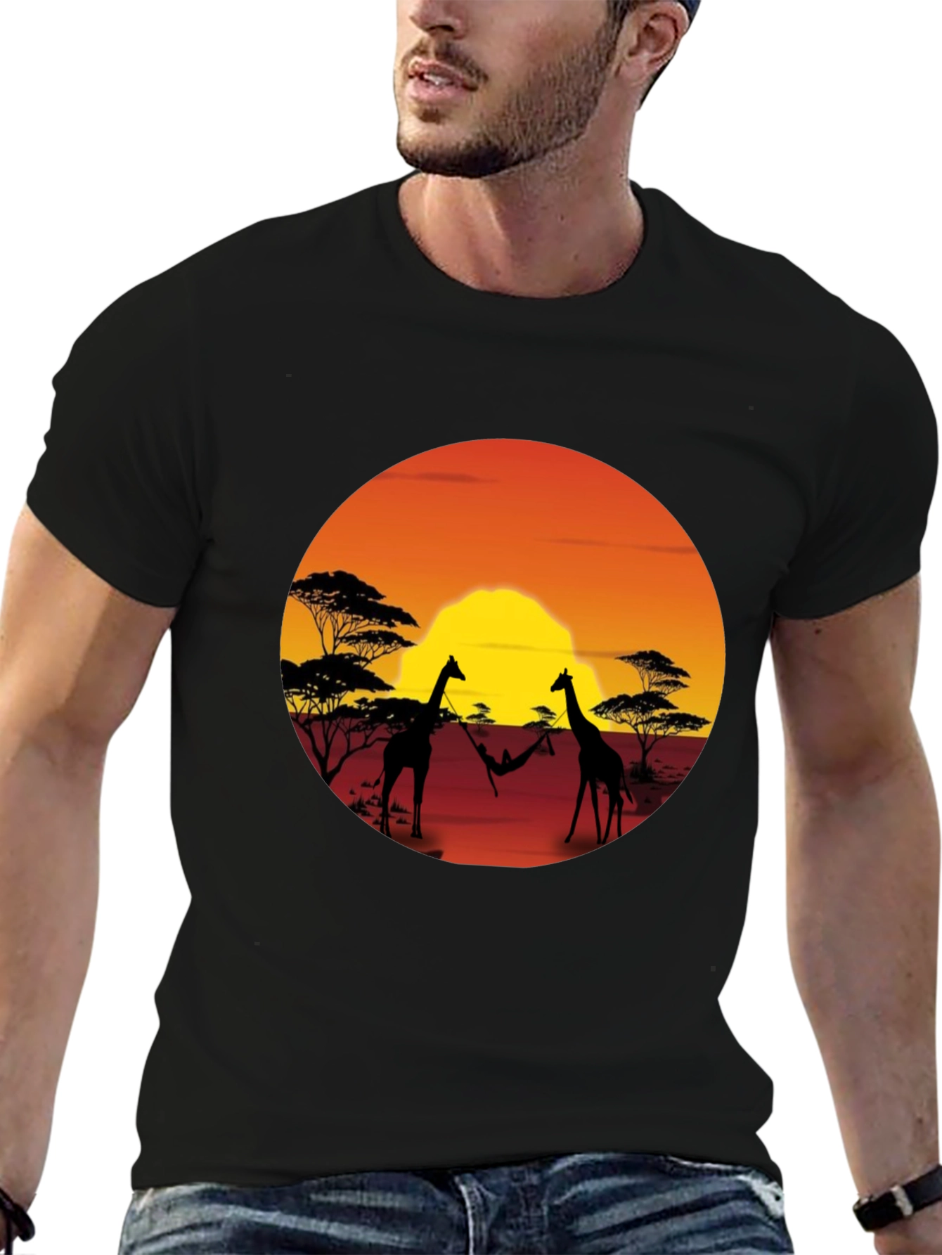 Capture the spirit of the African savanna with this eye-catching t-shirt. Featuring a striking silhouette design of giraffes against a vibrant sunset backdrop, this shirt is a stylish way to express your love for wildlife and nature. The design is printed on a black, classic fit t-shirt, perfect for casual wear. The breathable fabric ensures comfort, making it ideal for everyday activities, travel, or relaxing at home. Wear it to stand out in a crowd or as a conversation starter. This t-shirt is a must-have for animal lovers and adventurers alike. Get yours today and wear the wild!