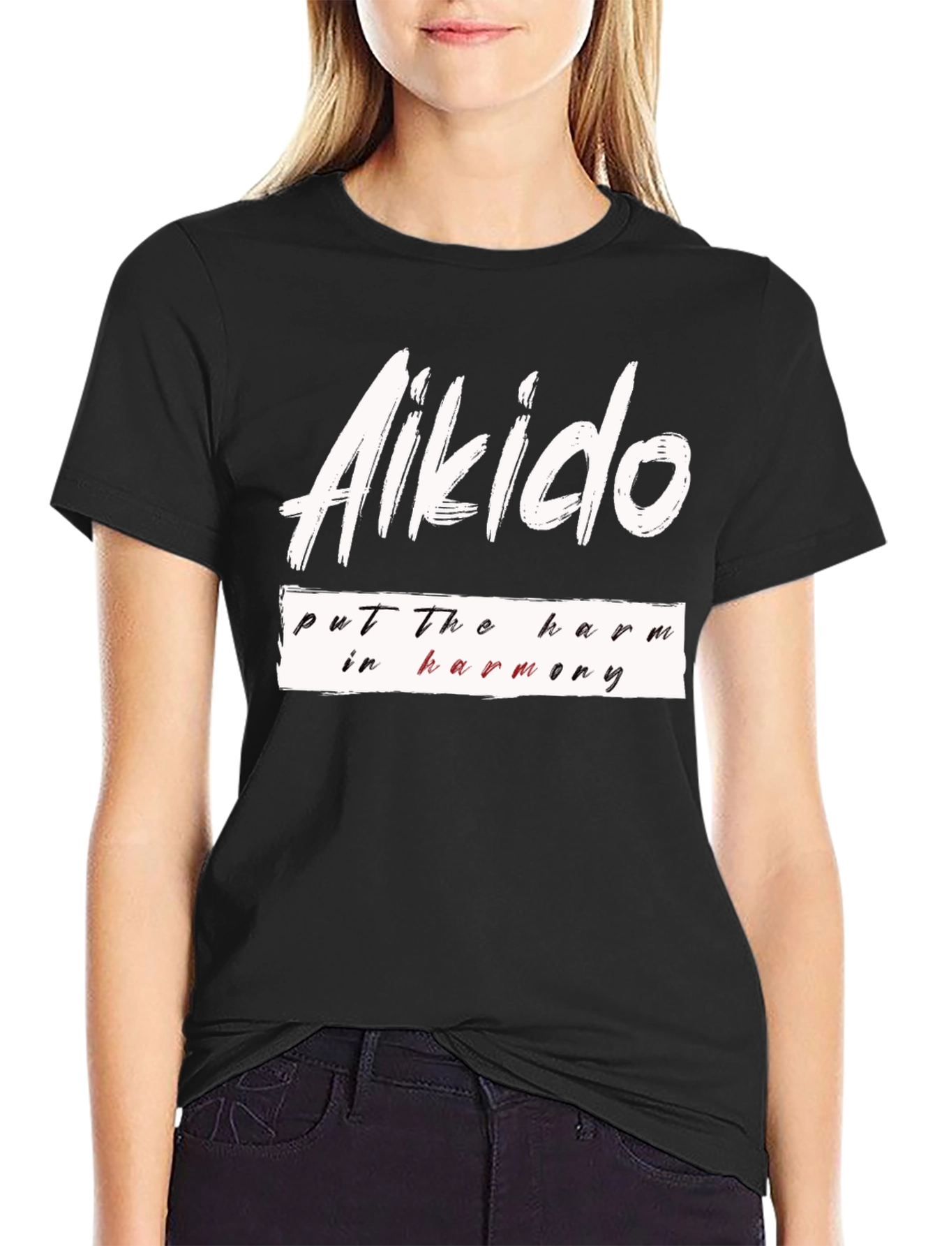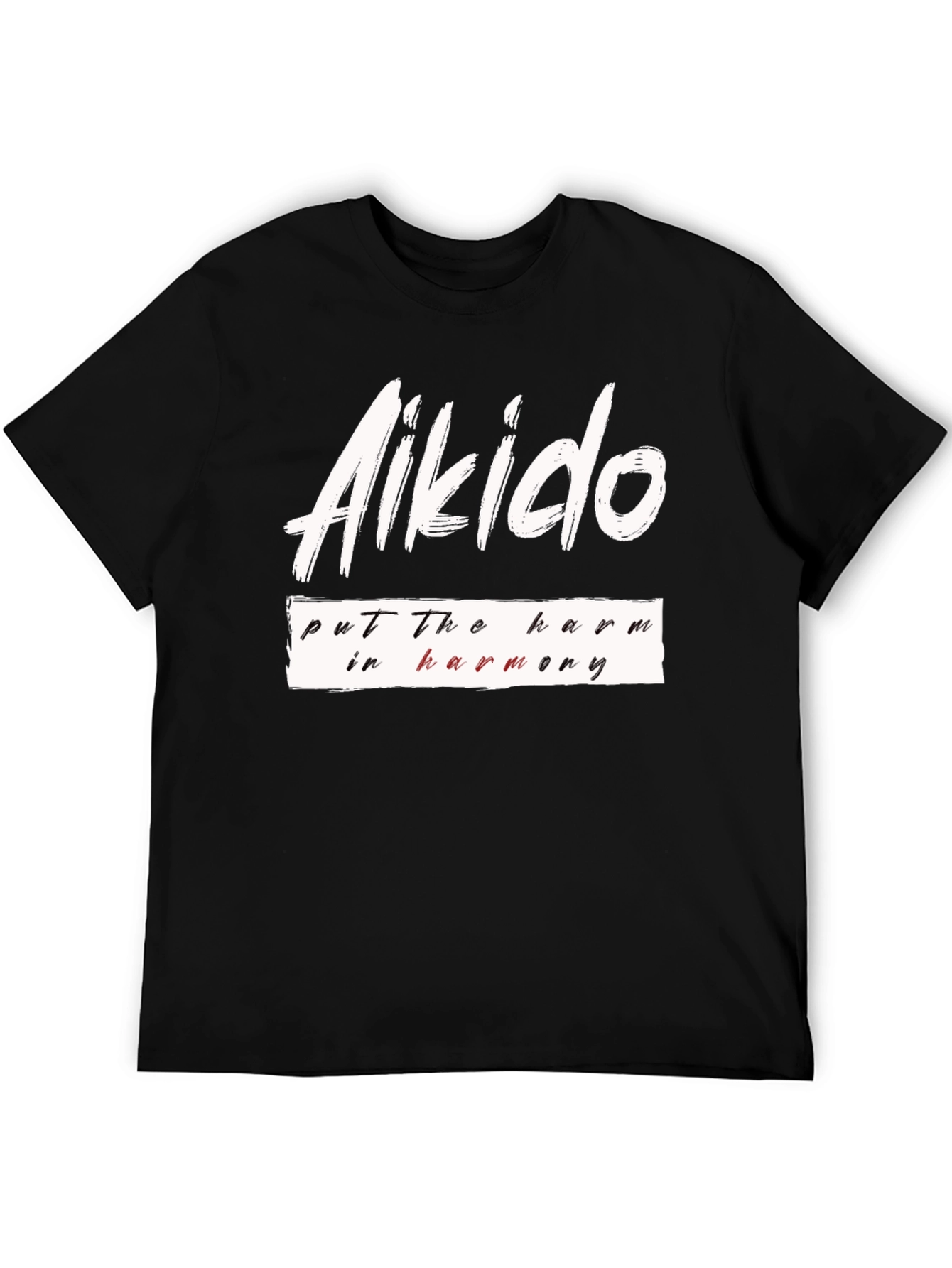 Showcase your love for Aikido with this stylish black t-shirt. Featuring a bold "Aikido" graphic in white, complemented by the playful phrase "put the harm in harmony", this tee is sure to turn heads. The design is printed on a soft and comfortable black fabric, perfect for everyday wear or training sessions. Express your passion for martial arts with a touch of humor. This t-shirt is a great conversation starter and a must-have for Aikido enthusiasts.
