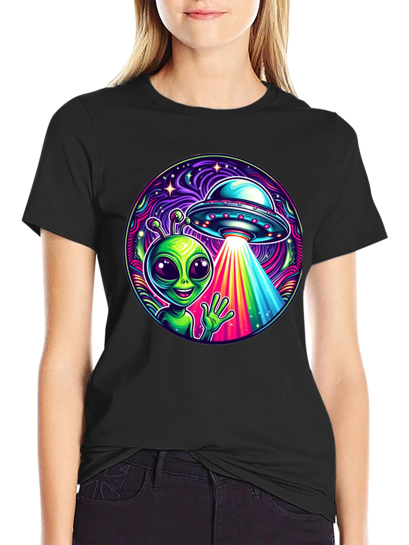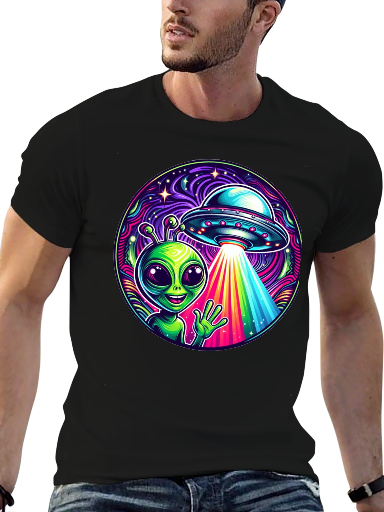 Beam into style with this eye-catching graphic t-shirt! This black tee features a vibrant and colorful print of a friendly green alien waving, standing under a classic flying saucer with a dazzling rainbow beam. The design is set against a swirling psychedelic background of stars and cosmic hues. Made from a comfortable fabric, this shirt is perfect for casual wear, parties, or expressing your unique personality. Ideal for sci-fi fans, alien enthusiasts, or anyone who loves to stand out from the crowd. Get ready to turn heads with this fun and fashionable statement piece!