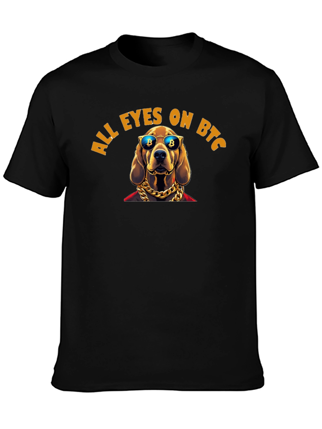 Show your support for Bitcoin with this unique t-shirt. Featuring a cartoon dog wearing sunglasses with the Bitcoin logo, and gold chains. The bold "All Eyes On BTC" lettering makes a statement. Perfect for casual wear, crypto meetups, or as a gift for any crypto enthusiast. The shirt appears to be made from a comfortable, breathable fabric, ideal for everyday use. Get yours today and join the crypto revolution!