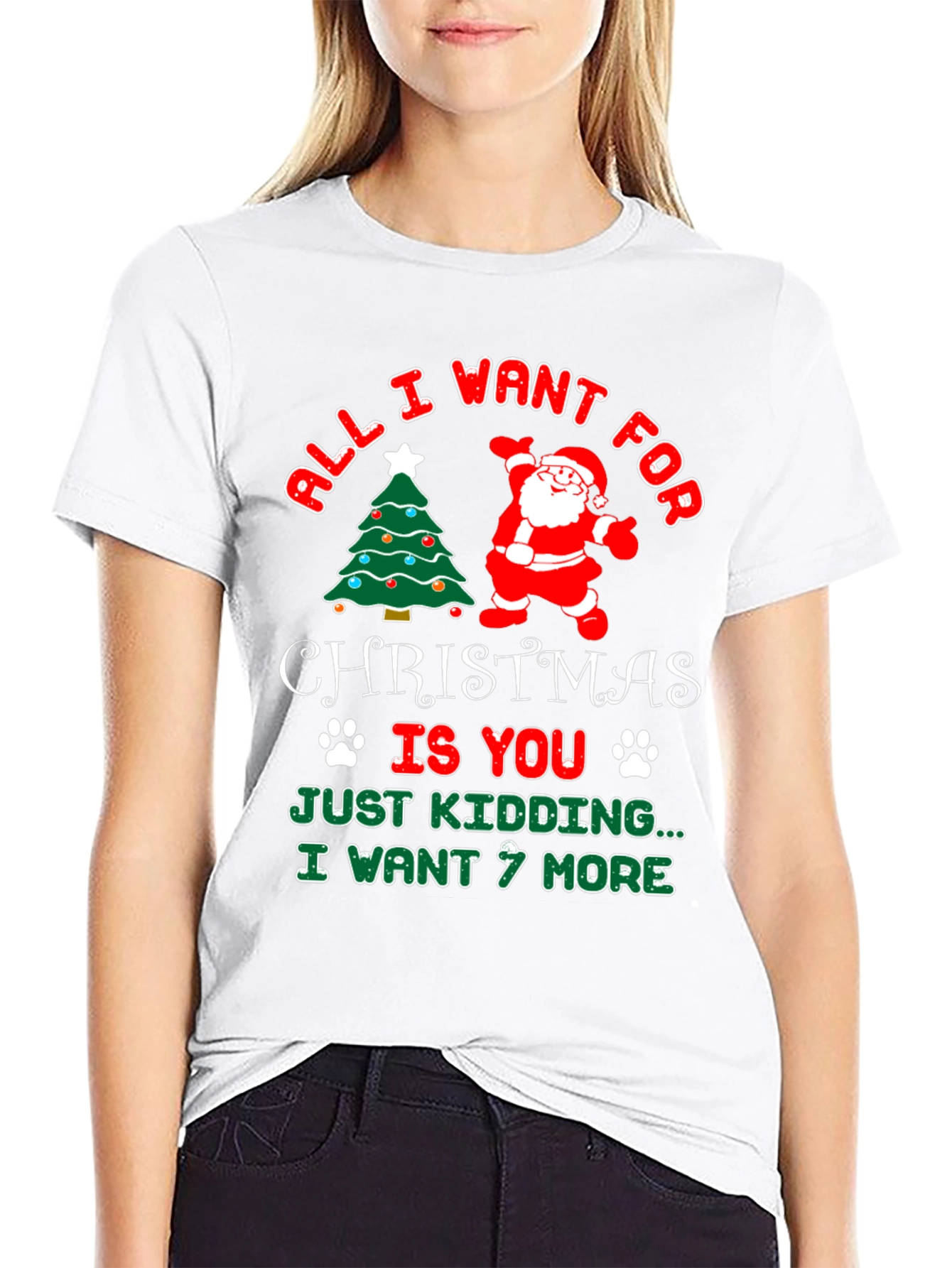 Spread some holiday cheer with this playful "All I Want for Christmas" t-shirt. The black tee features a festive design, including a Christmas tree, Santa Claus, and the humorous text "All I Want for Christmas is you. Just kidding... I want 7 more." The design is printed in vibrant red and green colors, which gives a classic Christmas feel. Made from a comfortable-looking fabric, this t-shirt is perfect for Christmas parties, family gatherings, or just showing off your holiday spirit. This tee is sure to bring laughter and joy to everyone around you. This is perfect for those who love Christmas and a bit of humor.