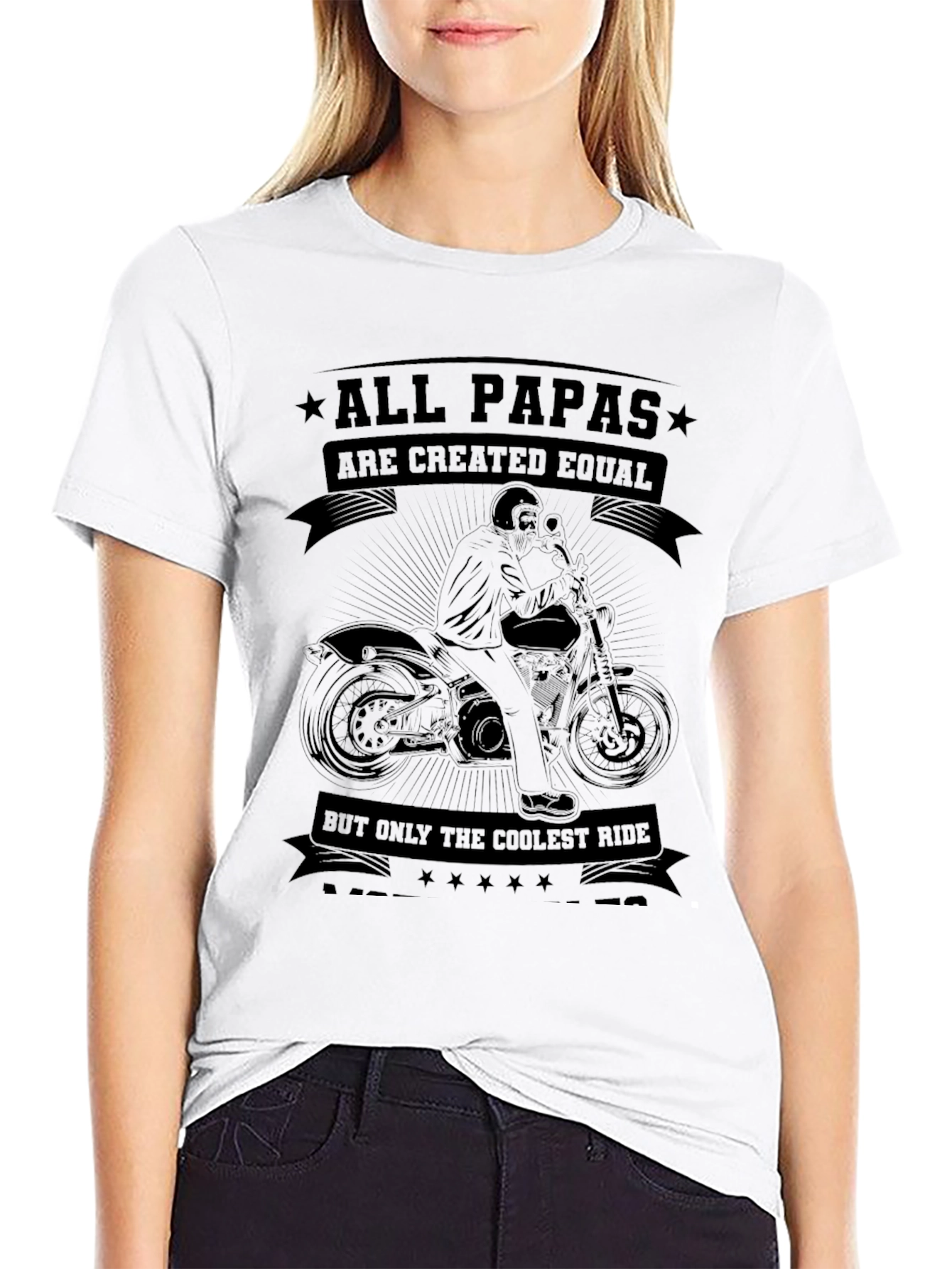 Show your love for papas who ride with this unique graphic tee. The design features the phrase "All Papas Are Created Equal, But Only The Coolest Ride Motorcycle," along with a cool graphic of a motorcyclist on a bike. This black tee is made of comfortable material, ideal for everyday wear or hitting the open road. Perfect for gifting to a father who loves motorcycles or for any papa who wants to make a statement. A must-have addition to any biker dad's wardrobe!