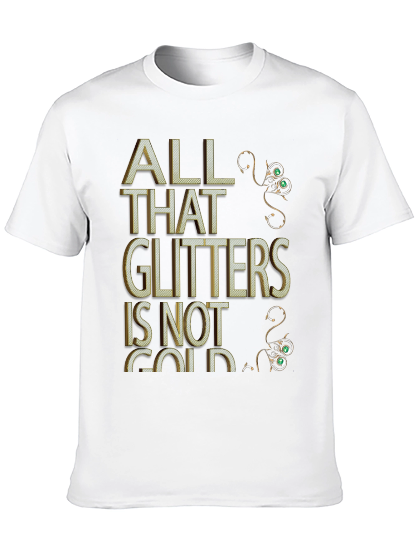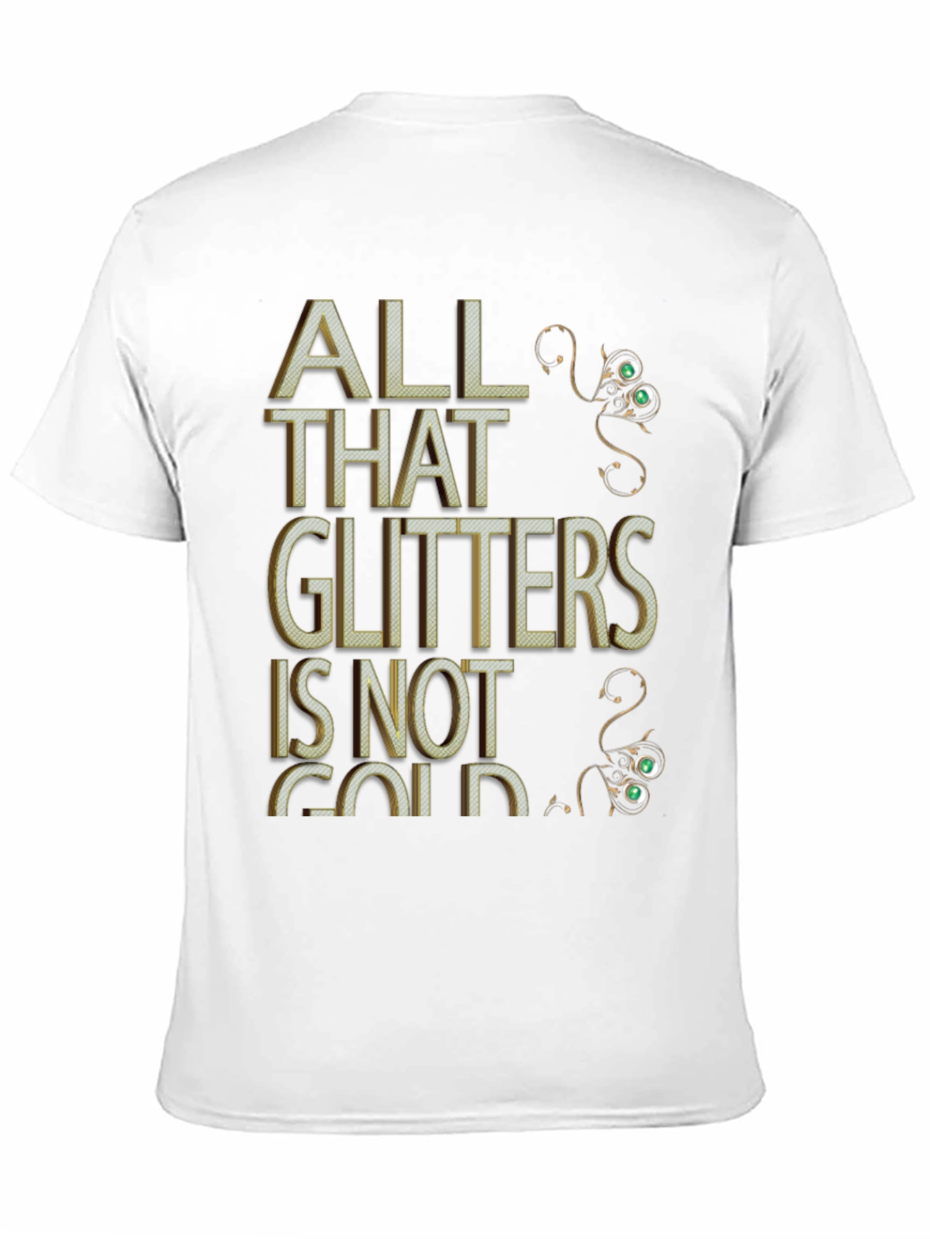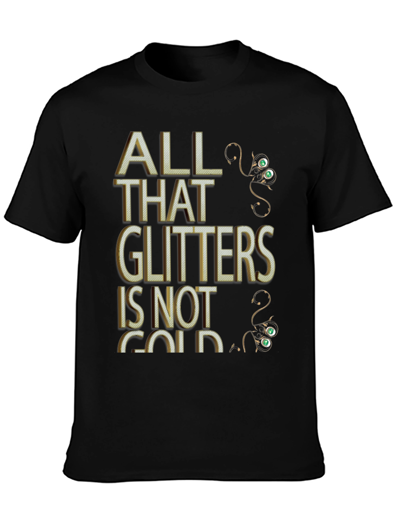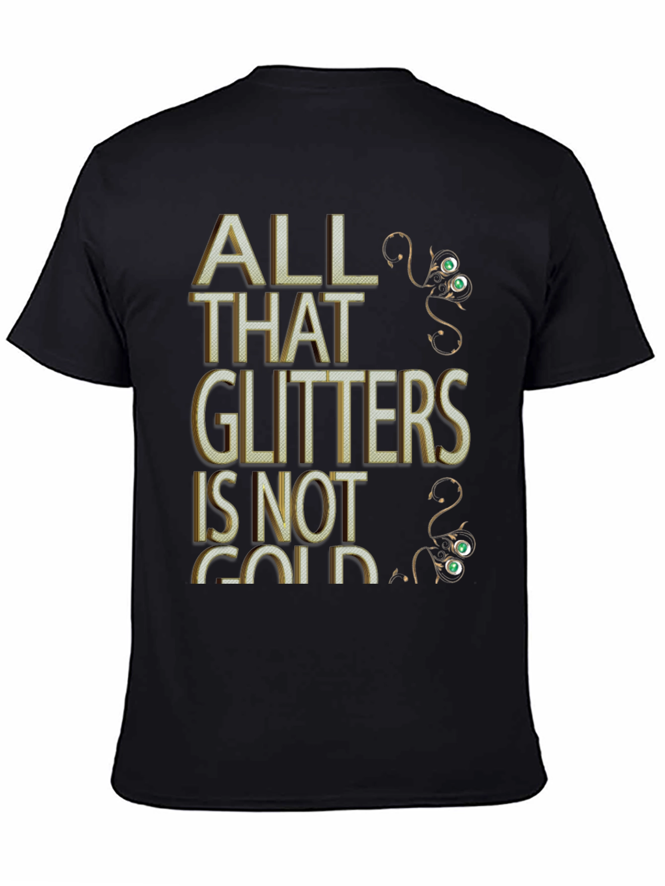 Elevate your wardrobe with this stylish black tee featuring the phrase "All That Glitters Is Not Gold" in a striking gold-tone design. The bold text is complemented by unique eye-catching embellishments. Made from comfortable, breathable fabric, this shirt is perfect for casual outings or making a statement. Pair it with jeans or shorts for a versatile, fashionable look. Show off your sophisticated side with this exceptional t-shirt, designed to turn heads and spark conversations wherever you go.