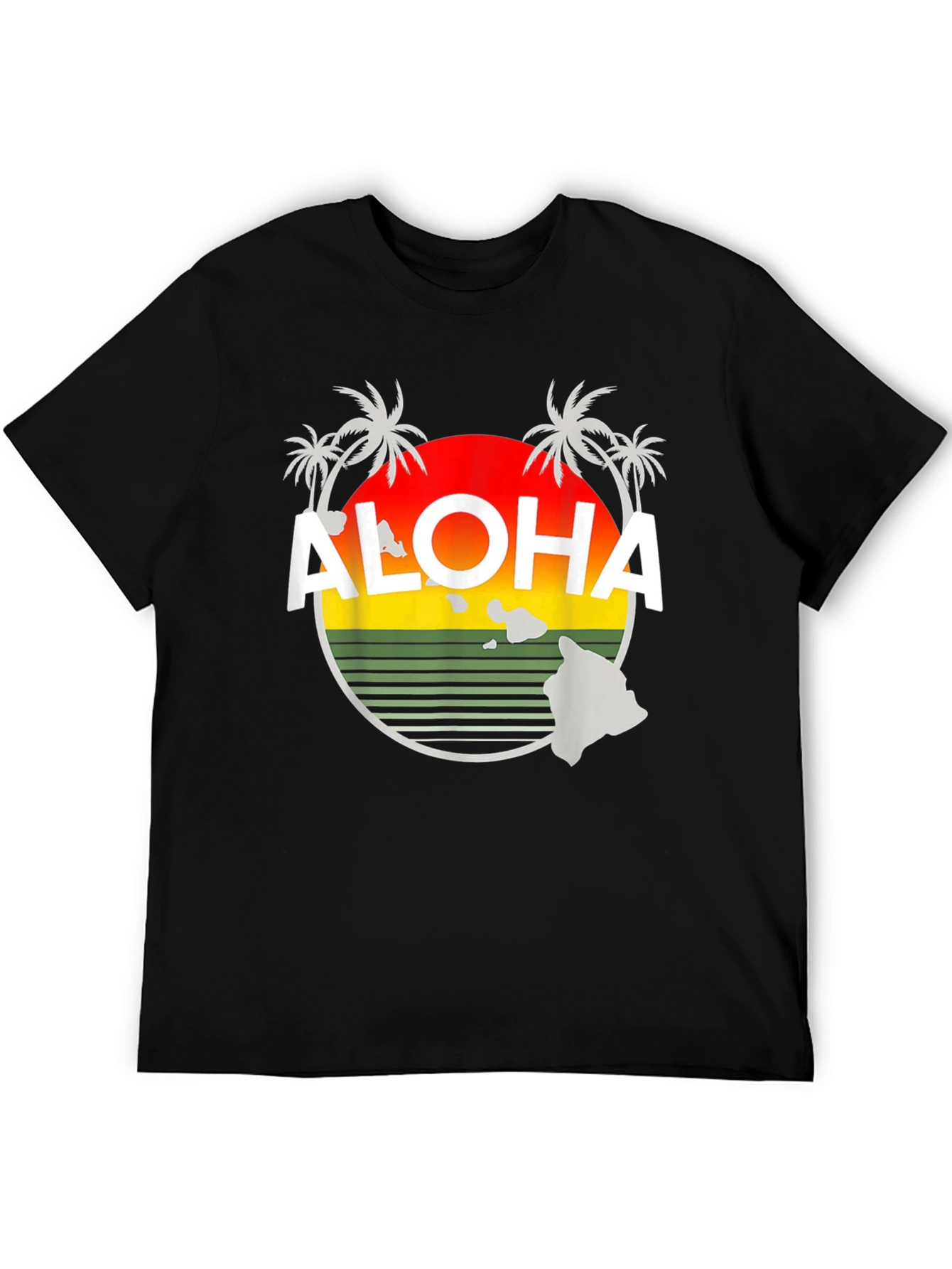 Embrace island vibes with this striking graphic t-shirt. The design features the word "ALOHA" in bold white lettering superimposed over a vibrant sunset. Palm trees evoke the laid-back atmosphere of Hawaii, while an island silhouette adds authenticity. The shirt is black, providing a classic and versatile base for the eye-catching graphic. Made from comfortable fabric, it's perfect for casual wear, beach outings, or simply expressing your love for the Hawaiian Islands. Wear a piece of paradise and let the Aloha spirit shine! This tee is sure to become a wardrobe favorite.