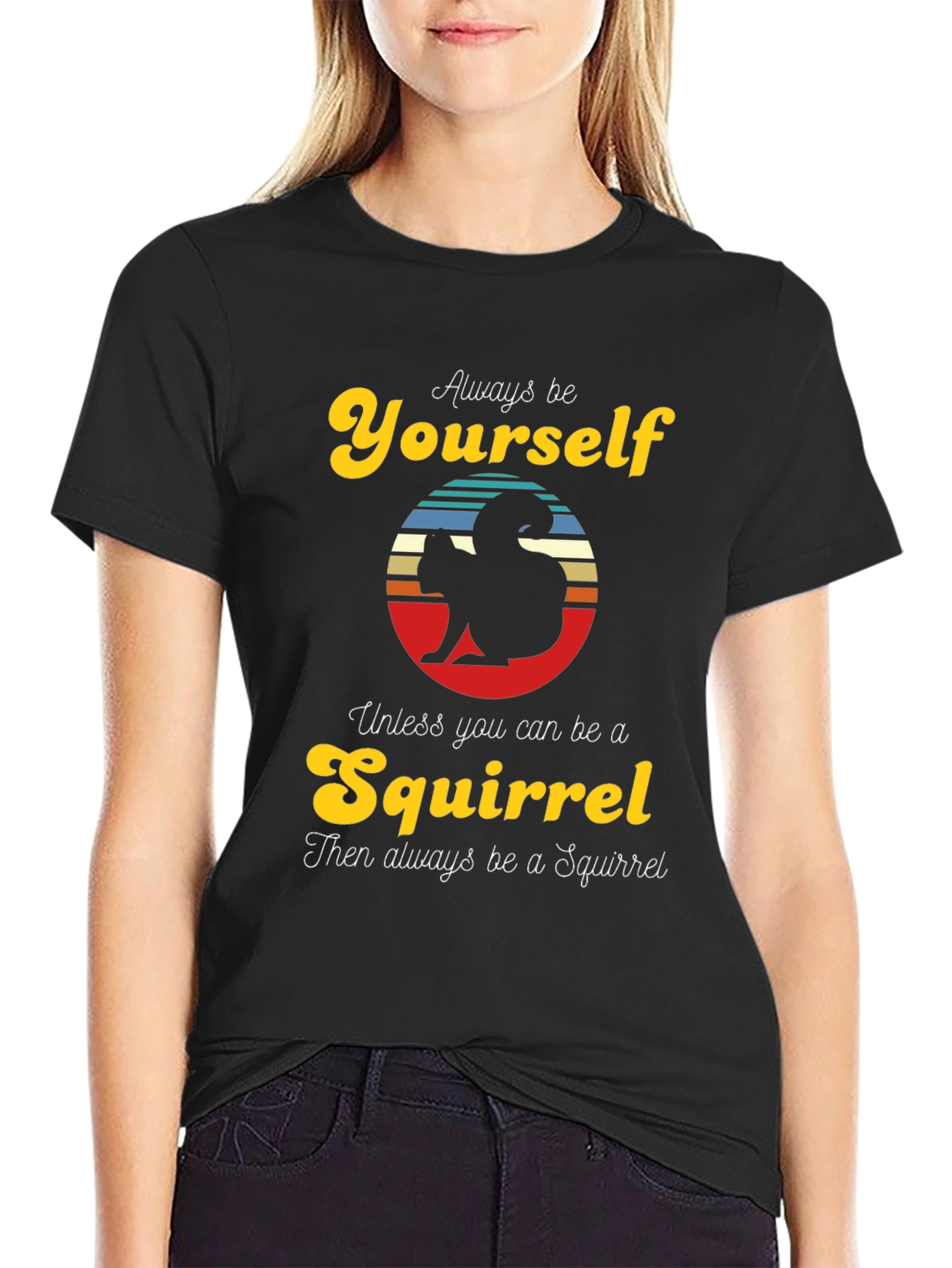 Show off your playful side with this fun and unique "Always Be Yourself Unless You Can Be A Squirrel" t-shirt. This black tee features a retro-style design with a silhouette of a squirrel set against a vintage-inspired striped circle. The whimsical quote is sure to bring a smile to anyone's face, making it a great conversation starter. Perfect for casual wear, nature lovers, or anyone with a quirky sense of humor, this t-shirt is a comfortable and stylish way to express your individuality.