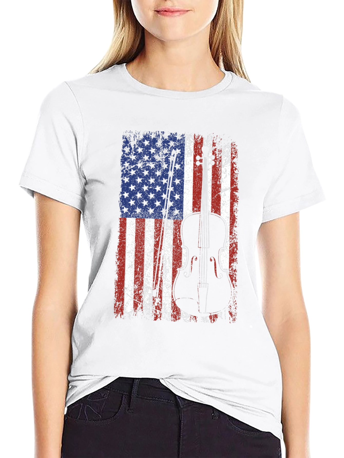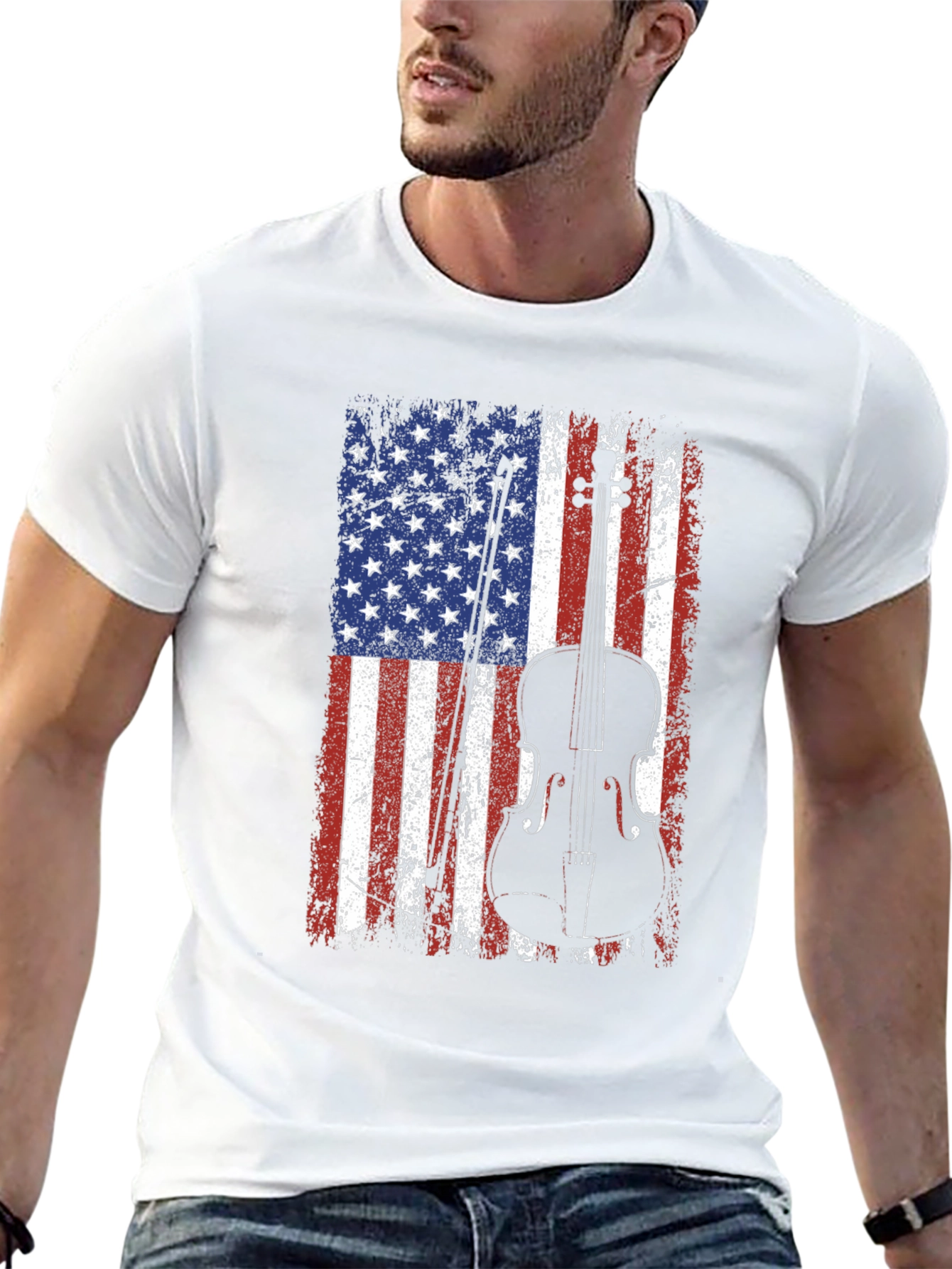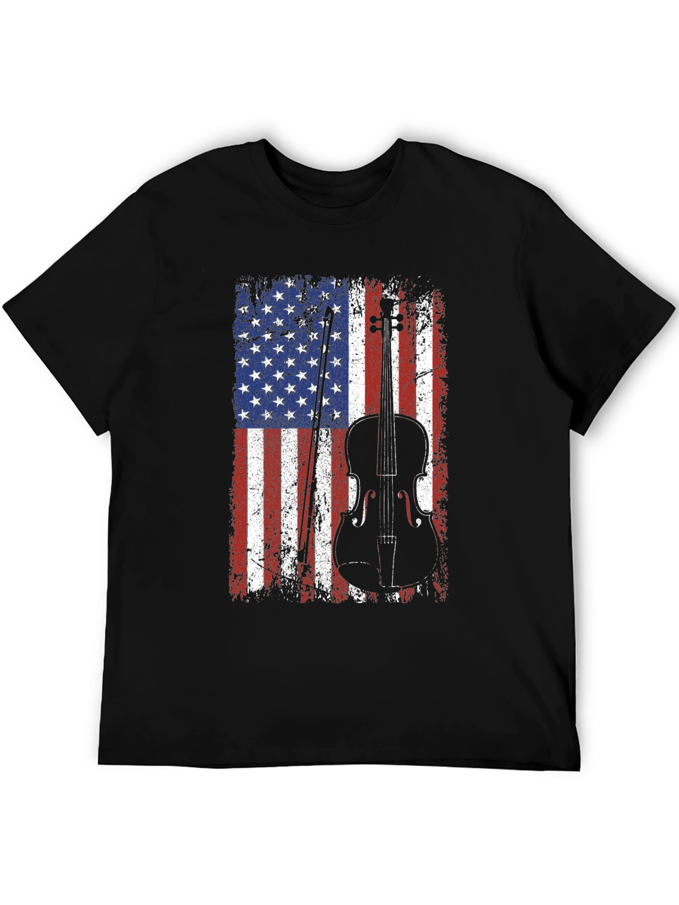 Showcase your patriotic passion for music with this unique t-shirt. Featuring a distressed American flag design overlaid with a silhouette of a violin and bow, this shirt makes a bold statement. The print gives a vintage and weathered look. Crafted from a comfortable and breathable fabric, this t-shirt is ideal for casual wear, concerts, music festivals, or as a gift for the musician in your life. The black background makes the colorful graphic pop. Wear your love for music and country with pride.