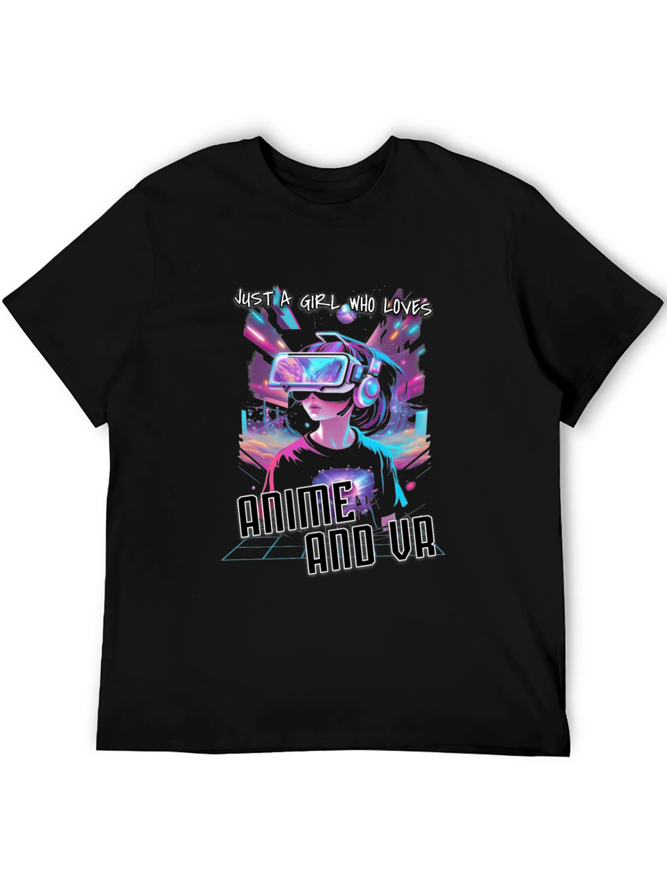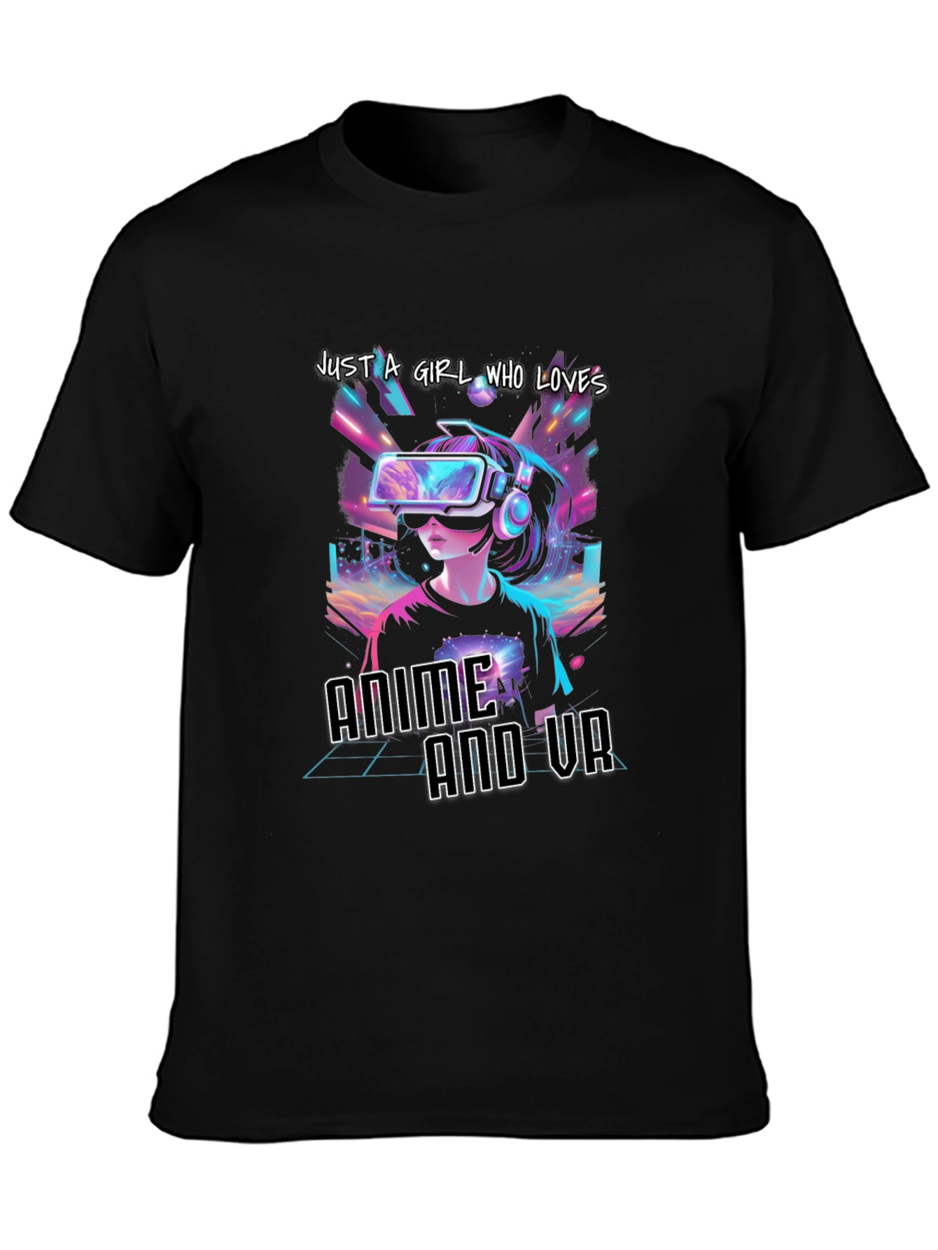 Immerse yourself in the virtual world with this unique t-shirt! Featuring a vibrant design of a girl wearing a VR headset, surrounded by neon lights and futuristic elements. This tee showcases the perfect fusion of anime aesthetics and VR gaming culture, with the phrase "Just a Girl Who Loves Anime and VR." printed in eye-catching graphics. Ideal for anime lovers and gaming enthusiasts, this shirt offers both style and comfort. Made with soft, breathable fabric, it's perfect for everyday wear or gaming sessions. Wear your passion and let the world know what you love!