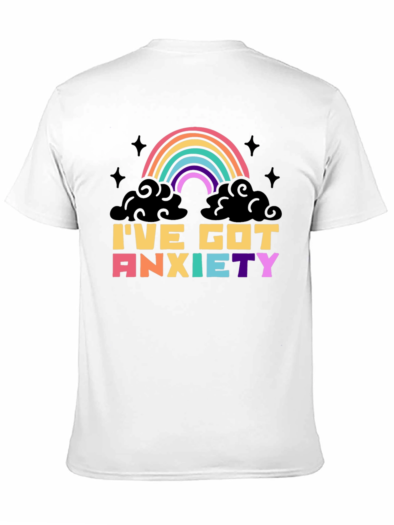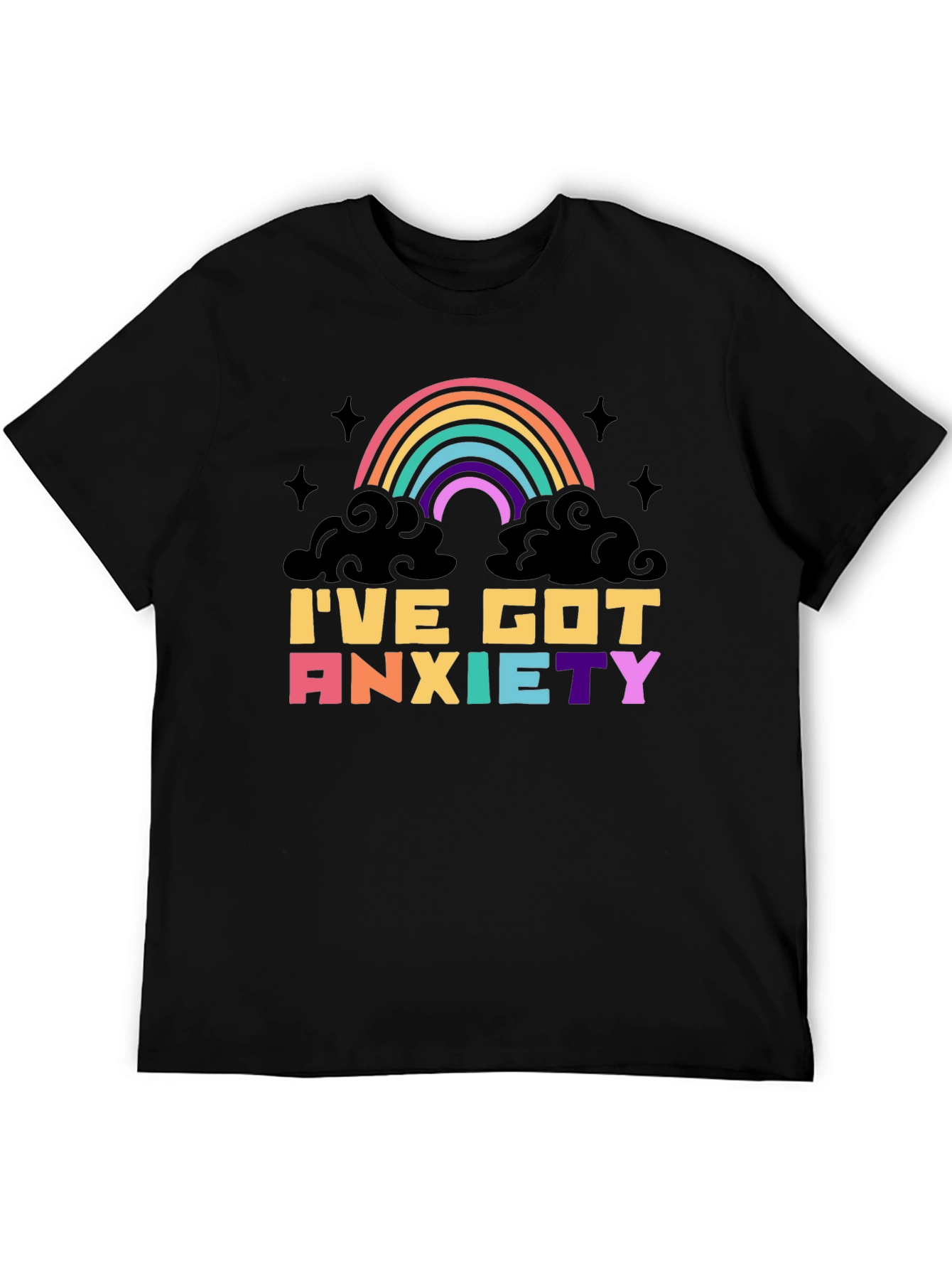 Embrace your emotions with this stylish black t-shirt featuring a vibrant rainbow graphic. The design includes fluffy clouds, sparkling stars, and the bold statement "I'VE GOT ANXIETY" in playful, multi-colored letters. Made from a soft, comfortable fabric, this tee is perfect for everyday wear and self-expression. Show the world you're not afraid to be real and support mental health awareness with this unique and eye-catching t-shirt. Great for casual outings, lounging at home, or as a conversation starter. A must-have addition to your wardrobe!
