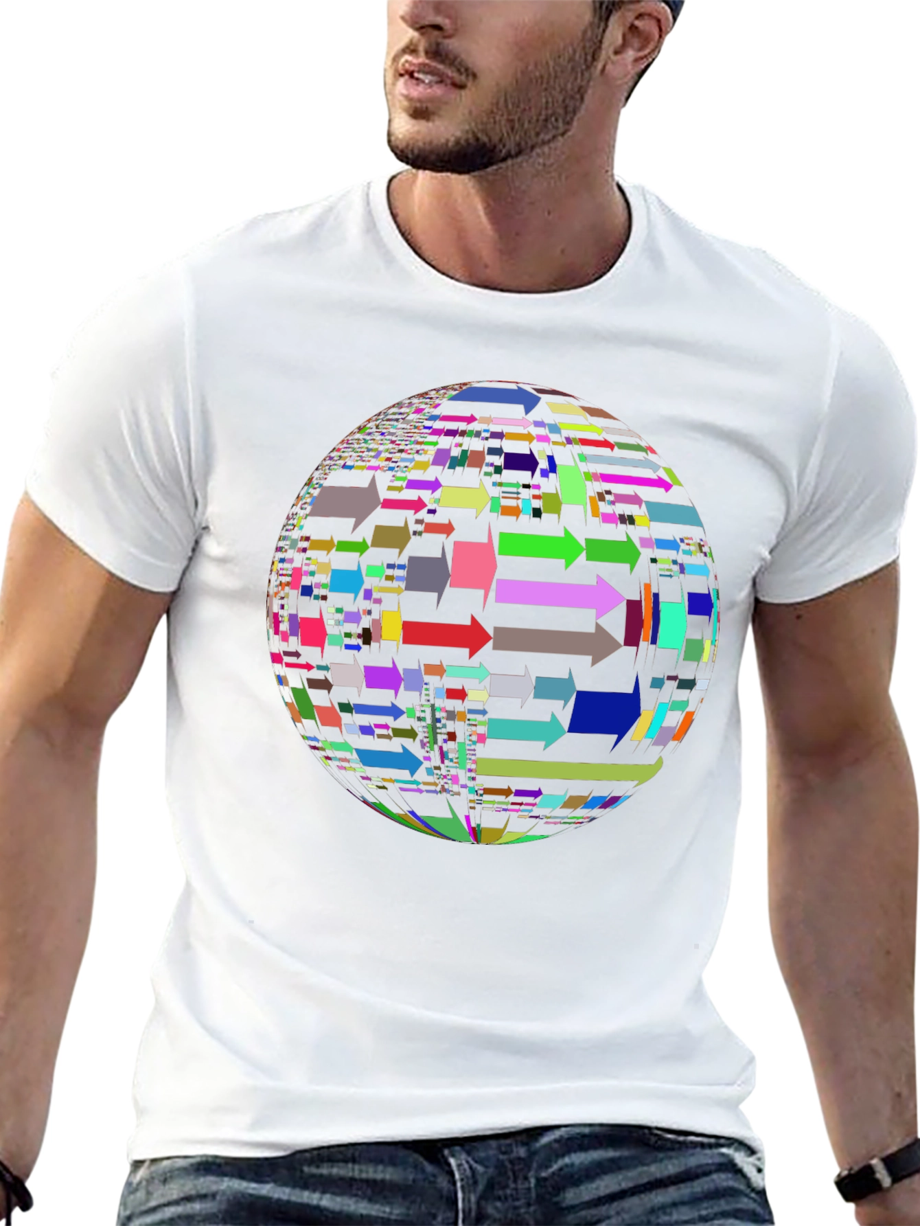 Make a bold statement with this eye-catching black t-shirt! The shirt features a vibrant, spherical design composed of multi-colored arrows pointing in various directions. The intricate pattern creates a unique and captivating visual effect. Made from a comfortable, breathable fabric, this tee is perfect for everyday wear. Show off your individual style and add a touch of artistic flair to your wardrobe with this awesome graphic tee. A perfect conversation starter, this t-shirt is sure to turn heads wherever you go. Ideal for casual outings, concerts, or simply lounging around, this tee offers both comfort and style.