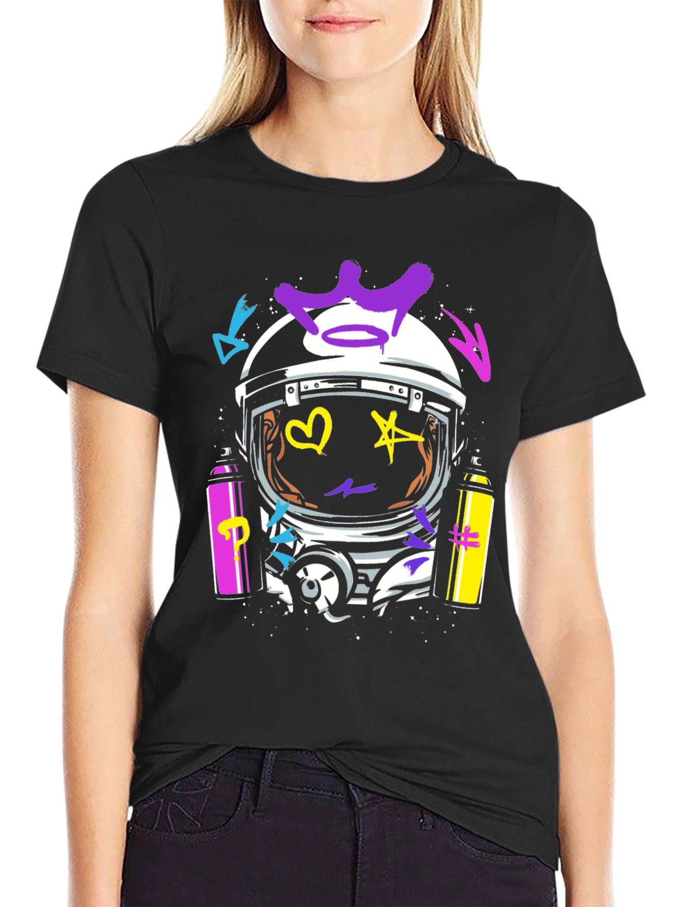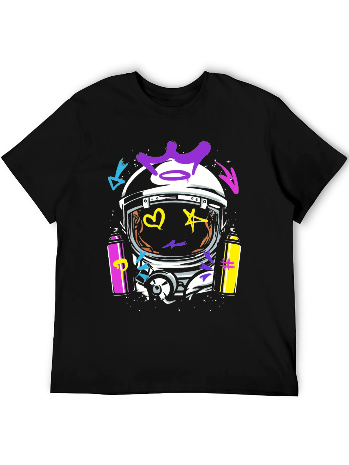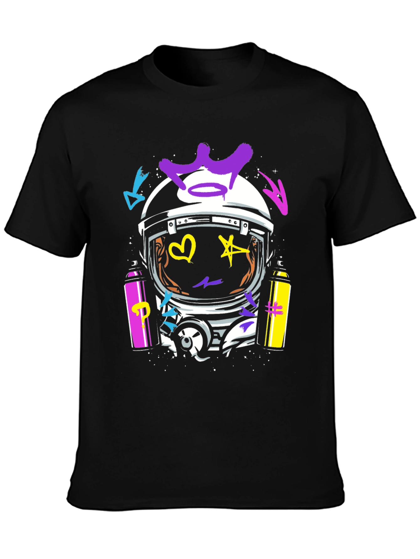 Make a statement with this eye-catching black tee featuring a unique astronaut helmet design. The helmet is adorned with vibrant, colorful graffiti art including a crown, heart, star, and various abstract shapes in purple, yellow, and blue. Two spray paint cans frame the design, adding to the urban aesthetic. Crafted from soft, breathable fabric, this tee ensures all-day comfort. Perfect for expressing your individual style, this graphic tee is ideal for casual outings, concerts, or adding an edgy touch to your everyday look. Stand out from the crowd and showcase your love for street art with this bold and trendy piece.