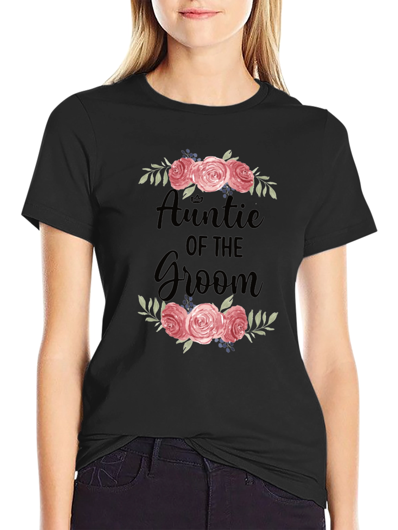 Celebrate a special wedding day with this stylish 'Auntie of the Groom' t-shirt. The design features elegant floral accents with roses and foliage surrounding the calligraphic text. Perfect for the proud auntie, this shirt is a comfortable and fashionable way to show your love and support for the happy couple. It's ideal for wearing to the rehearsal dinner, wedding reception, or any pre-wedding celebrations. The design makes it a memorable keepsake. Wear it with pride and share in the joy of the occasion!