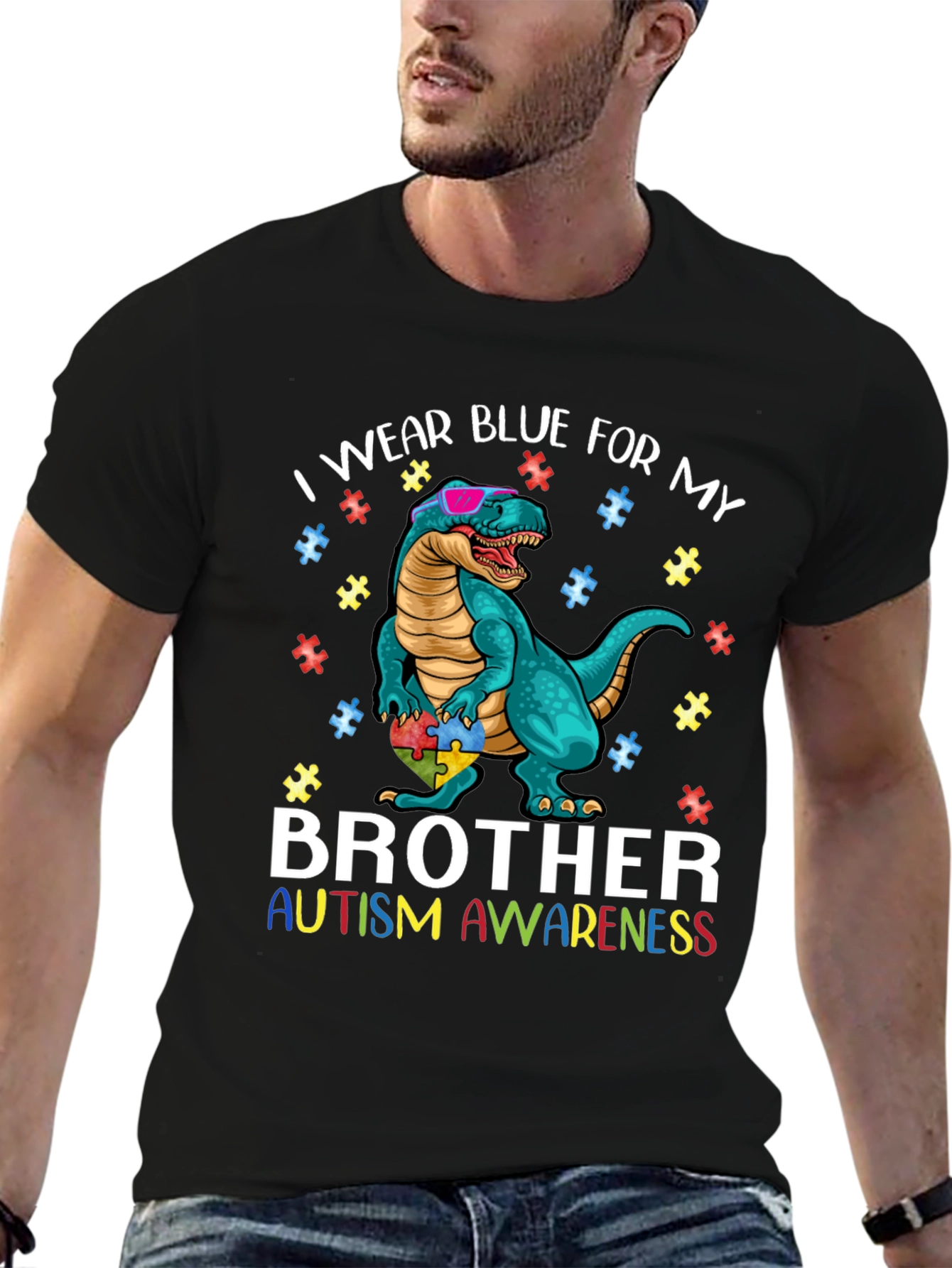 Show your support with this black t-shirt featuring a charming blue dinosaur wearing sunglasses. The dinosaur graphic holds a colorful puzzle piece, symbolizing autism awareness. Above and below the dinosaur, vibrant puzzle pieces accent the phrase "I WEAR BLUE FOR MY BROTHER" and "AUTISM AWARENESS". The shirt is a classic crew neck style, perfect for casual wear and showcasing your support for autism awareness. Wear it to walks, events, or everyday to spread awareness and show love for your brother.