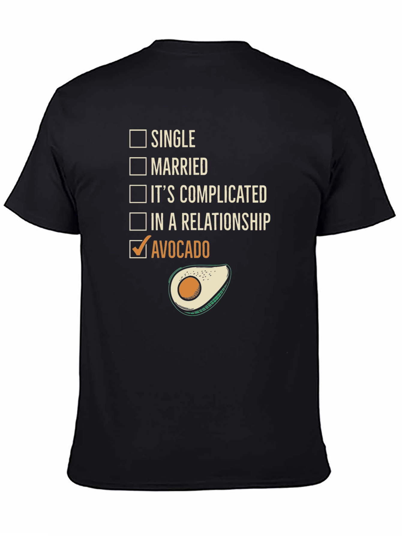 Express your love for avocados with this fun and quirky t-shirt! Made from a comfortable, dark-colored fabric, this tee features a humorous design listing relationship statuses: Single, Married, It's Complicated, In A Relationship. The Avocado option is cheekily selected with a check mark and an adorable avocado illustration. Perfect for casual wear, avocado lovers, and anyone with a sense of humor. This tee is sure to spark conversations and bring smiles wherever you go. Grab yours now and show off your avocado affection!