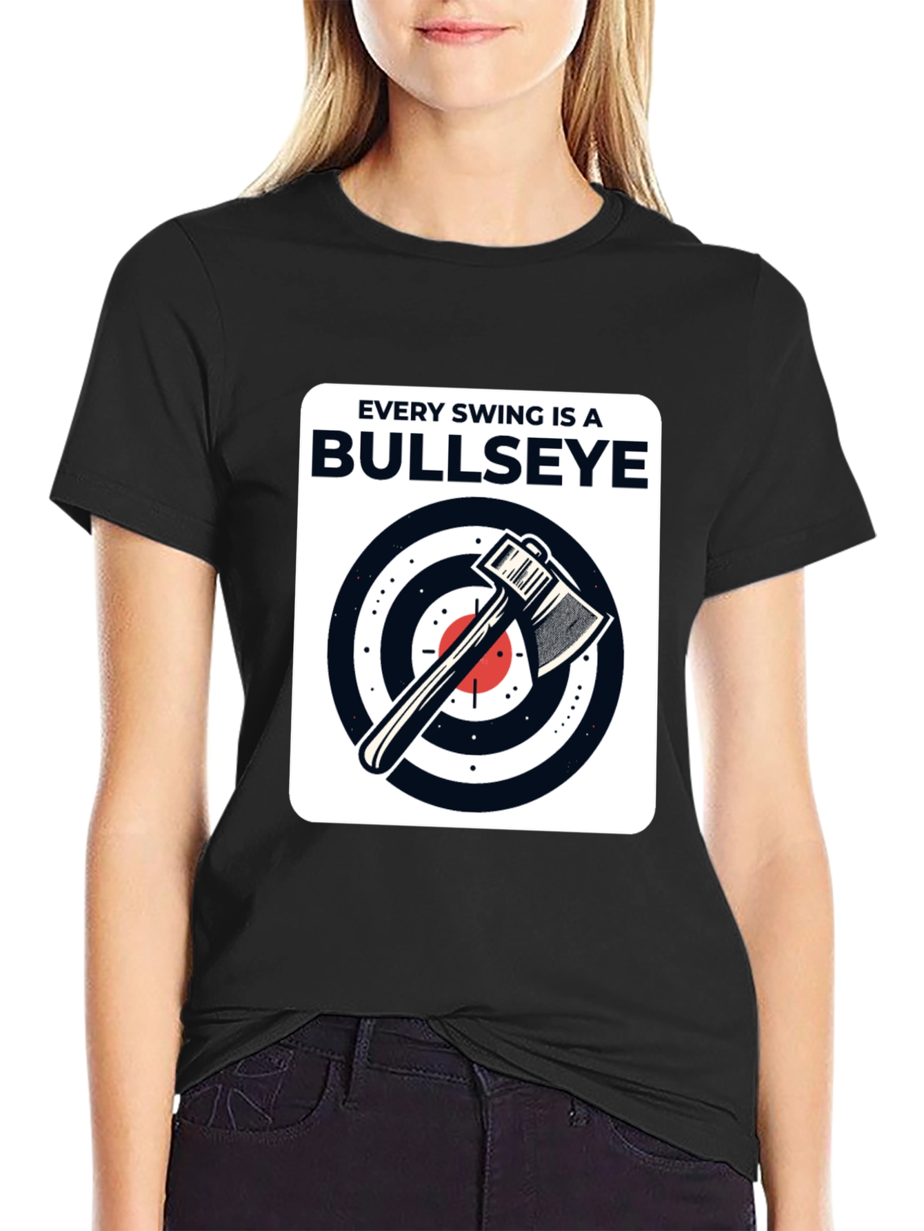 This black T-shirt features a bold graphic design perfect for axe throwing enthusiasts. The print showcases an axe striking a bullseye target, surrounded by the catchy phrase "EVERY SWING IS A BULLSEYE." Made from comfortable, breathable fabric, this tee is ideal for casual wear, axe throwing events, or as a unique gift for the axe lover in your life. The design is eye-catching and sure to spark conversation. Show off your passion for axe throwing with this stylish and fun T-shirt!