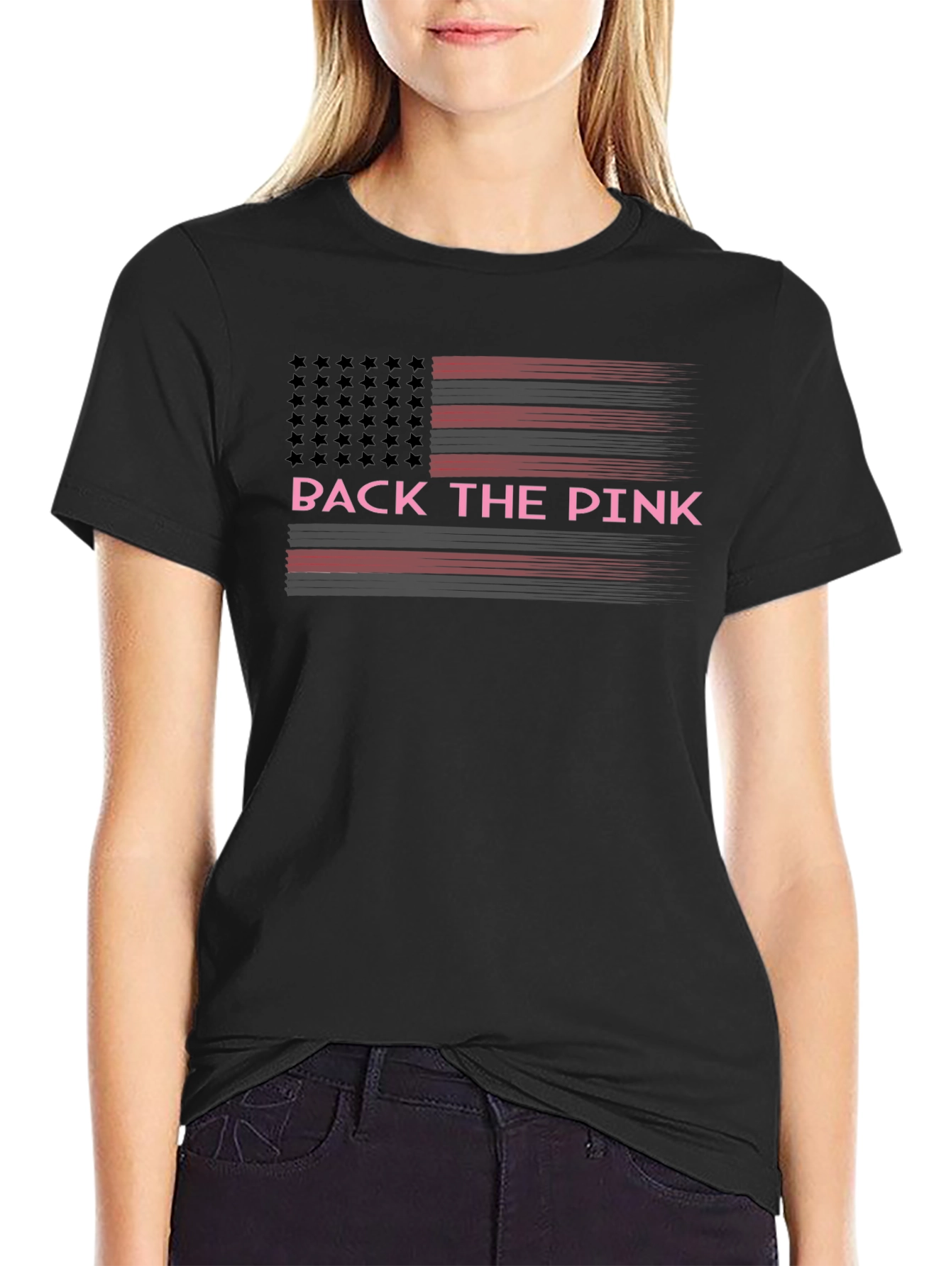 Show your support with this unique black t-shirt featuring a faded American flag design in red and black. The phrase 'BACK THE PINK' is prominently displayed in pink, highlighting breast cancer awareness. Made from a comfortable-looking material, this shirt is perfect for casual wear and making a statement. Ideal for walks, rallies, or everyday advocacy, this t-shirt allows you to spread awareness in style. The distressed design adds a touch of ruggedness, while the vibrant pink brings attention to the cause. A great gift for supporters and survivors alike!