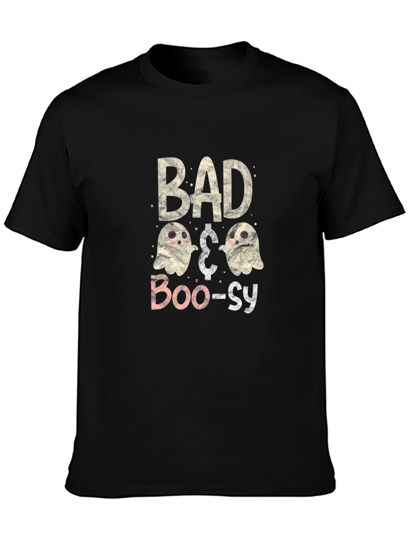 Get ready for Halloween with this fun and spooky graphic tee! The black t-shirt features a playful design with the word "BAD" printed in a textured, distressed font, accompanied by two cute ghost illustrations and a dollar sign. The phrase "Boo-sy" completes the look in a complimentary font. This short-sleeved tee is perfect for casual wear, Halloween parties, or trick-or-treating. Made from a comfortable fabric, this shirt is great for expressing your spooky spirit with a touch of humor. Stand out this Halloween season with this unique and eye-catching t-shirt!