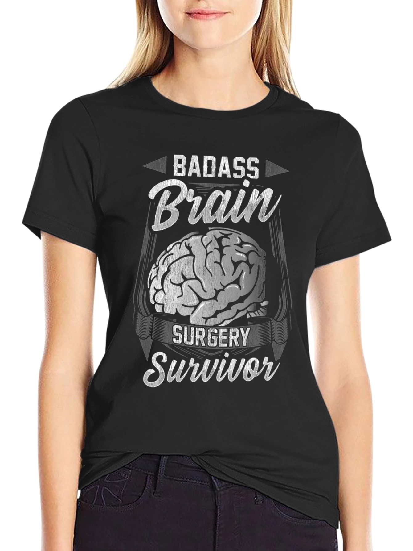 Show your strength with this bold black t-shirt. Featuring a striking graphic of a brain intertwined with the words "BADASS", "BRAIN SURGERY", and "SURVIVOR", it's a powerful statement of resilience. The design has a distressed vintage look giving it a touch of classic style. Made from comfortable, breathable fabric, this shirt is perfect for everyday wear, support group meetings, or any occasion where you want to display your warrior spirit. A meaningful and stylish way to celebrate life's battles and triumphs.