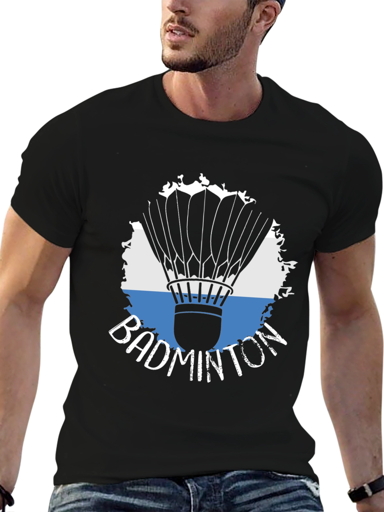 Show off your love for badminton with this unique graphic tee! This black t-shirt features a stylized badminton shuttlecock design in white and blue, encircled by the word "BADMINTON". The design offers a sporty and eye-catching look. Made from what appears to be a comfortable cotton blend, this tee is perfect for casual wear, sports events, or showing off your favorite hobby. A great gift for badminton players and fans alike! Add a touch of athletic flair to your wardrobe with this must-have graphic tee.