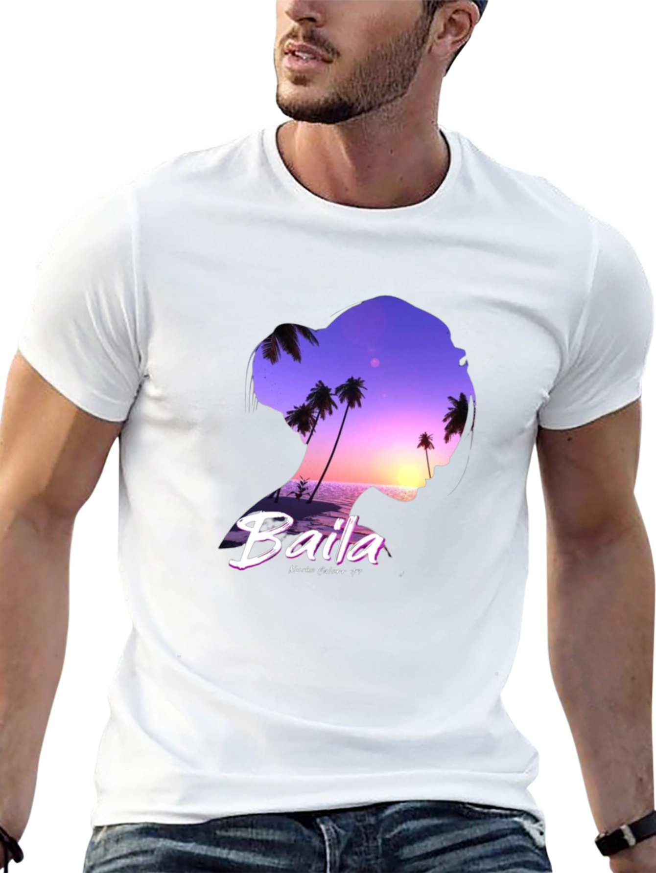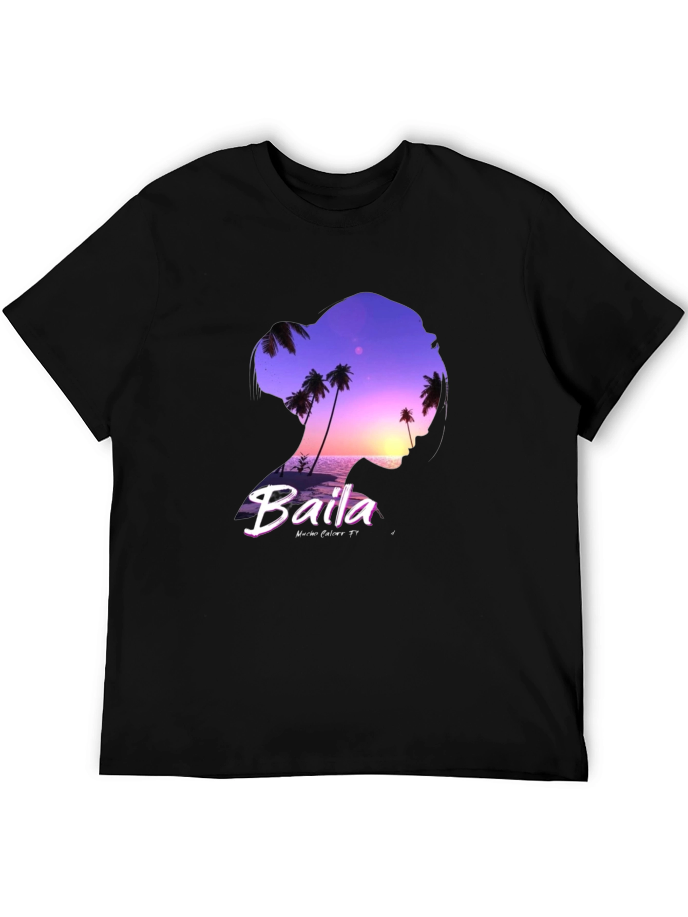Capture the spirit of summer with this stylish black t-shirt featuring a unique sunset silhouette design. The silhouette depicts a woman's profile filled with a vibrant tropical sunset scene, complete with palm trees and the word "Baila." Made from what appears to be a soft, comfortable cotton blend, this tee is perfect for casual wear. Ideal for beach lovers, dancers, or anyone who appreciates vibrant, eye-catching graphics. This t-shirt offers a relaxed fit and is sure to make a statement wherever you go.