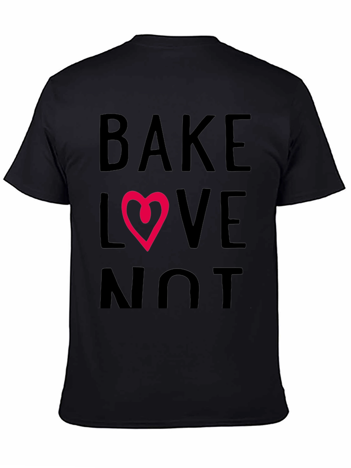 Show your passion for baking with this stylish black t-shirt. Featuring the bold statement "BAKE [Heart] LOVE NOT" in an eye-catching design, this tee is perfect for bakers and cooking enthusiasts. The design incorporates a heart in place of the word 'LOVE', adding a touch of whimsy. Made from a comfortable and breathable fabric, it's ideal for everyday wear, baking sessions, or casual outings. The classic fit ensures a relaxed and flattering look for all body types. Stand out and spread the message: Bake Love, Not Hate! Get yours today.
