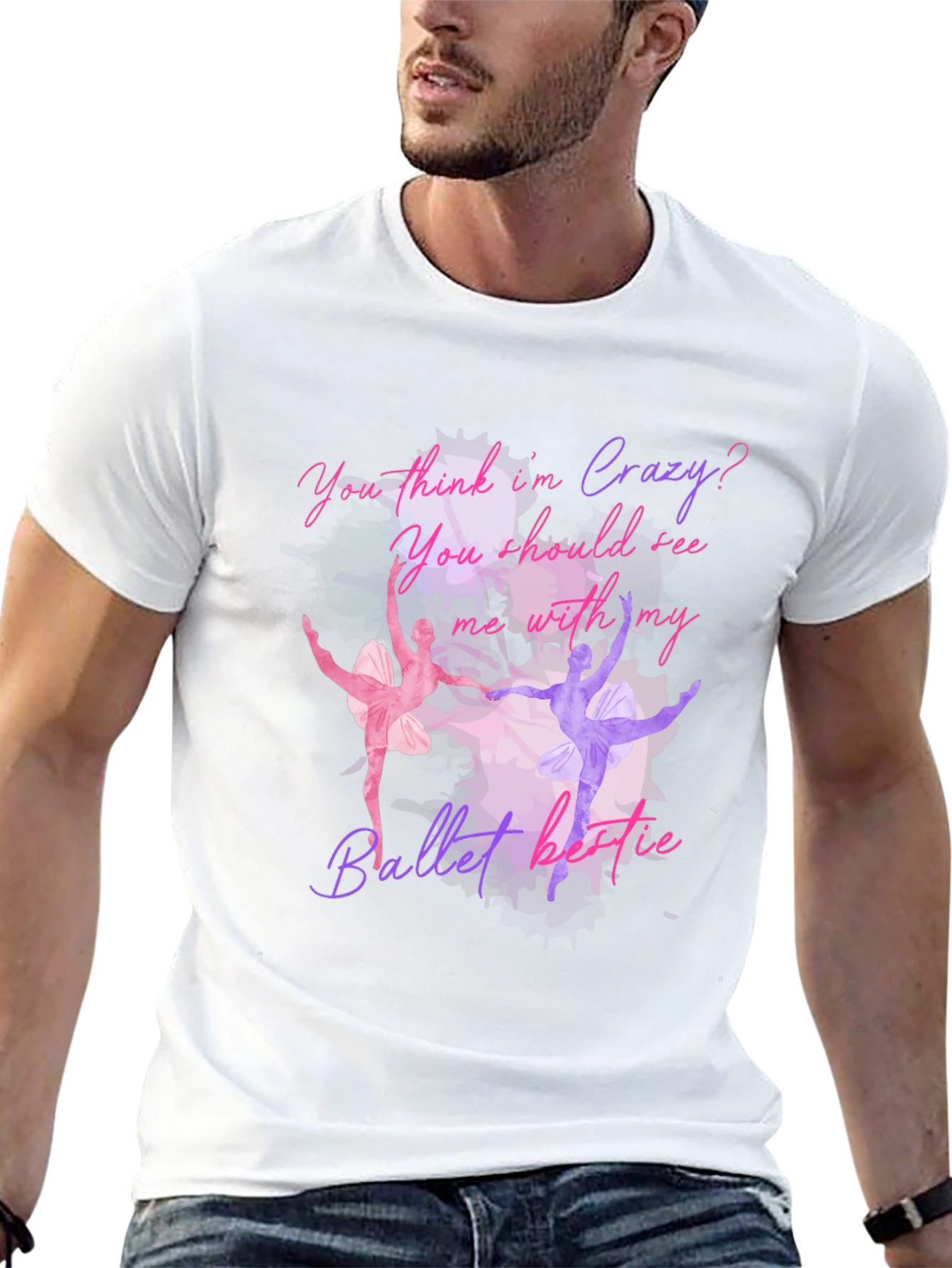 Dance to your own beat with this unique black graphic t-shirt. Featuring elegant ballet dancer silhouettes in shades of pink and purple against a watercolor splash backdrop. The eye-catching design includes the playful phrase "You think I'm Crazy? You should see me with my Ballet bestie", making it perfect for ballet enthusiasts and anyone who appreciates quirky style. Made from a comfortable-looking fabric, this tee offers both style and comfort. This shirt is ideal for casual outings, dance classes, or as a fun gift for your favorite ballet bestie.