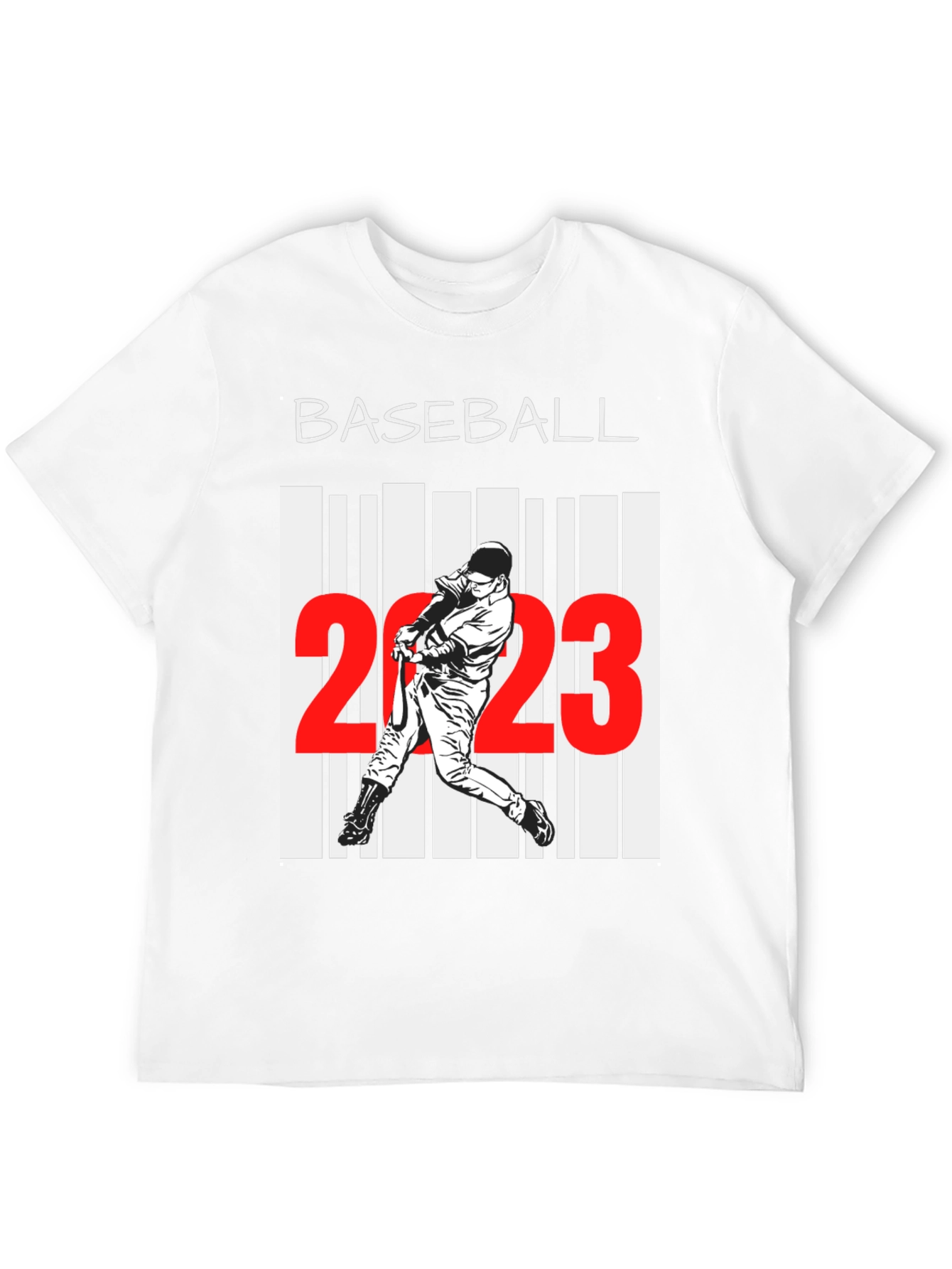 Show your love for the game with this stylish Baseball 2023 graphic t-shirt. This tee features a bold design with the word "BASEBALL" printed above a baseball player illustration and the large red numbers "2023." The design is set against a white background with vertical bars. Made from a comfortable black fabric, this shirt is perfect for casual wear or showing your team spirit at the ballpark. Whether you're a player, a fan, or just love the sport, this t-shirt is a must-have addition to your wardrobe. Its unique design and comfortable fit make it ideal for everyday wear. Grab yours today and swing into style!