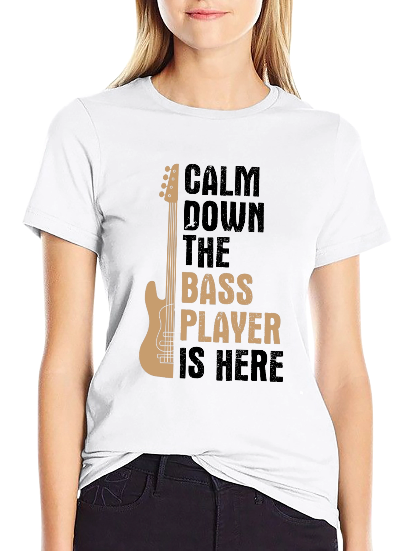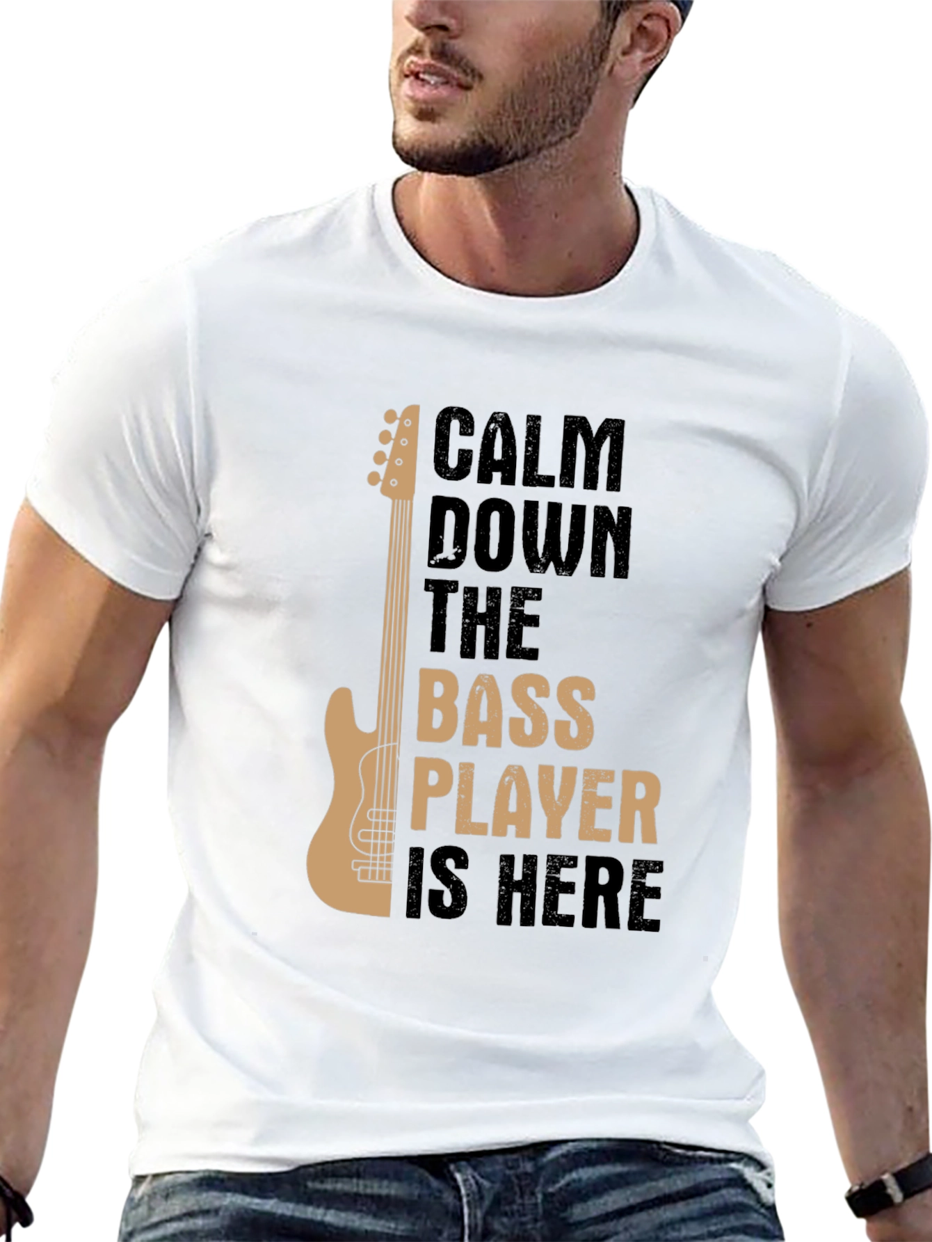 Show off your love for bass guitar with this stylish black t-shirt. The shirt features a creative design incorporating a bass guitar graphic with the phrase "Calm Down The Bass Player Is Here". Made from a comfortable, breathable fabric, this tee is perfect for casual wear, concerts, band practice, or simply expressing your passion for music. The design is bold and eye-catching, making it a great conversation starter. This t-shirt is an ideal gift for bass players, music enthusiasts, and anyone who appreciates a unique and comfortable graphic tee. Get yours today and let the world know you're a bass player!