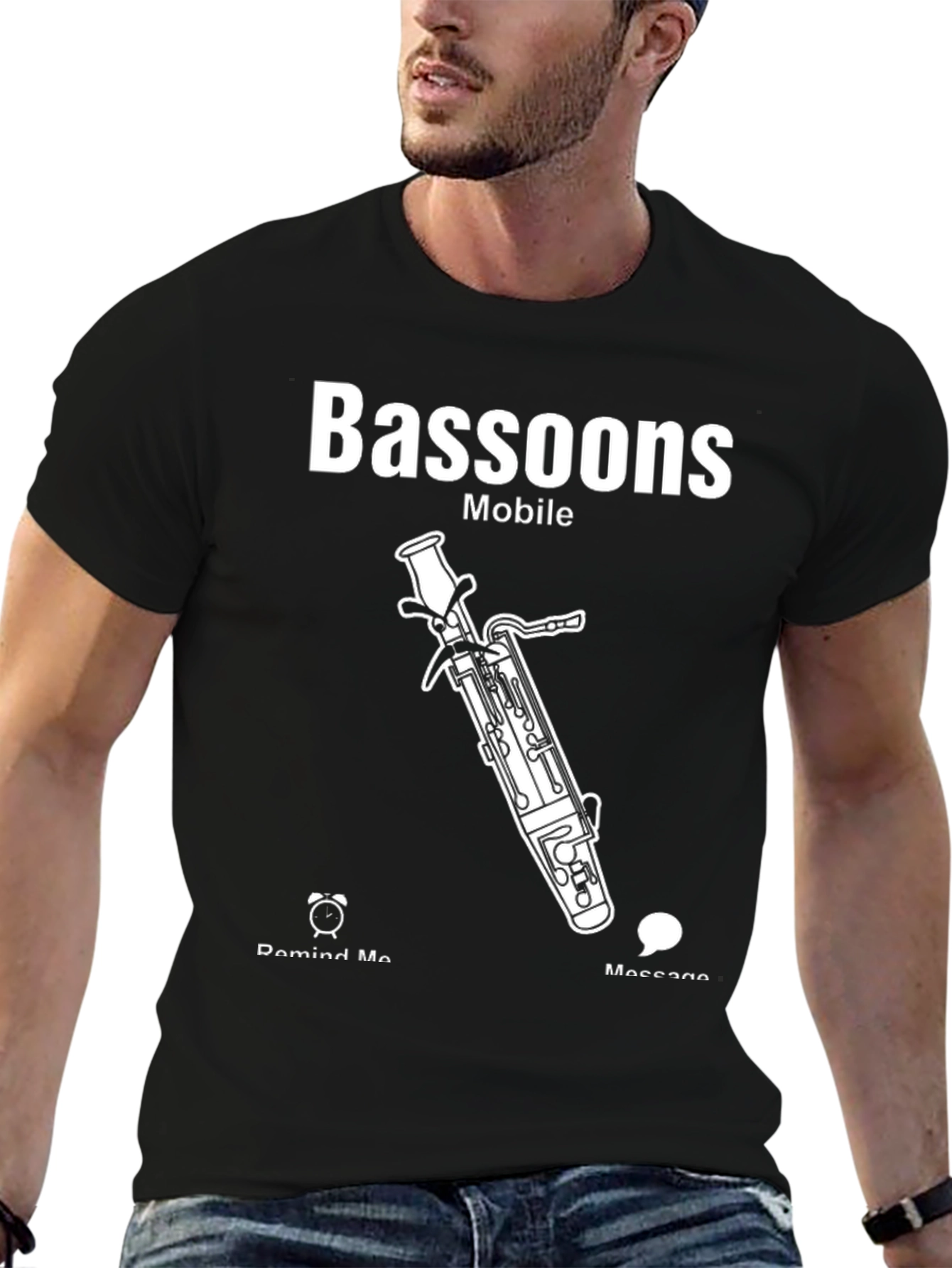 Show off your love for music with this stylish black t-shirt. Featuring a unique "Bassoons Mobile" design, it showcases a clever play on words alongside a detailed illustration of a bassoon. The minimalist white graphics stand out boldly against the black fabric. The shirt also incorporates playful icons representing 'remind me' and 'message' functions, adding a touch of modernity to the musical theme. Perfect for band members, music teachers, or anyone who appreciates the beauty of bassoons, this t-shirt is a must-have addition to your wardrobe. Wear it casually or to your next concert!