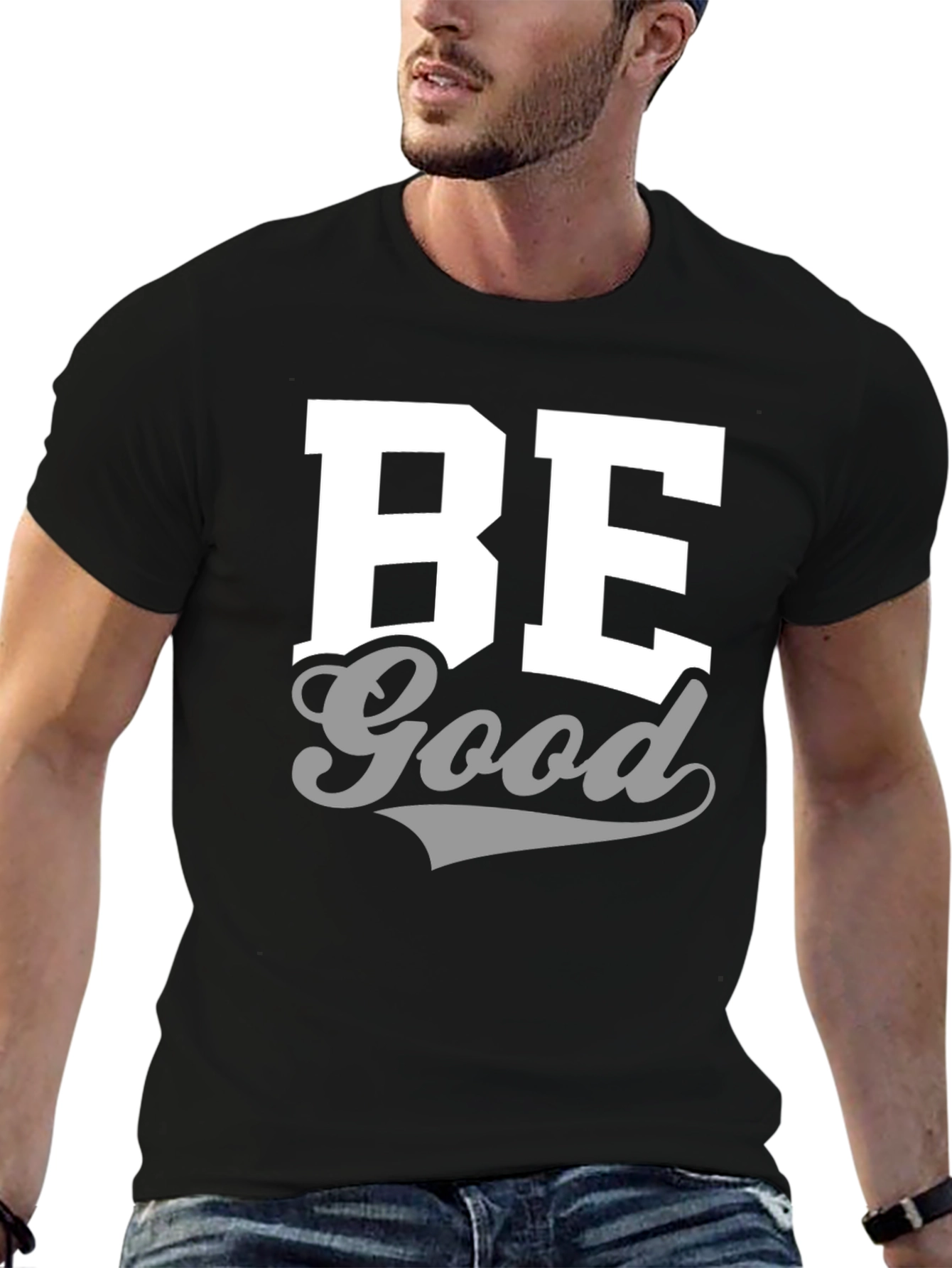 Show your good side with this stylish "Be Good" graphic tee. Made from comfortable fabric, this black t-shirt features a bold white "BE" on top with grey cursive that says "Good". The design is playful and eye-catching, making it a great choice for everyday wear. This casual shirt is perfect for running errands, hanging out with friends, or simply relaxing at home. It's a versatile addition to any wardrobe. Add a touch of positivity to your style with this unique and comfortable tee.