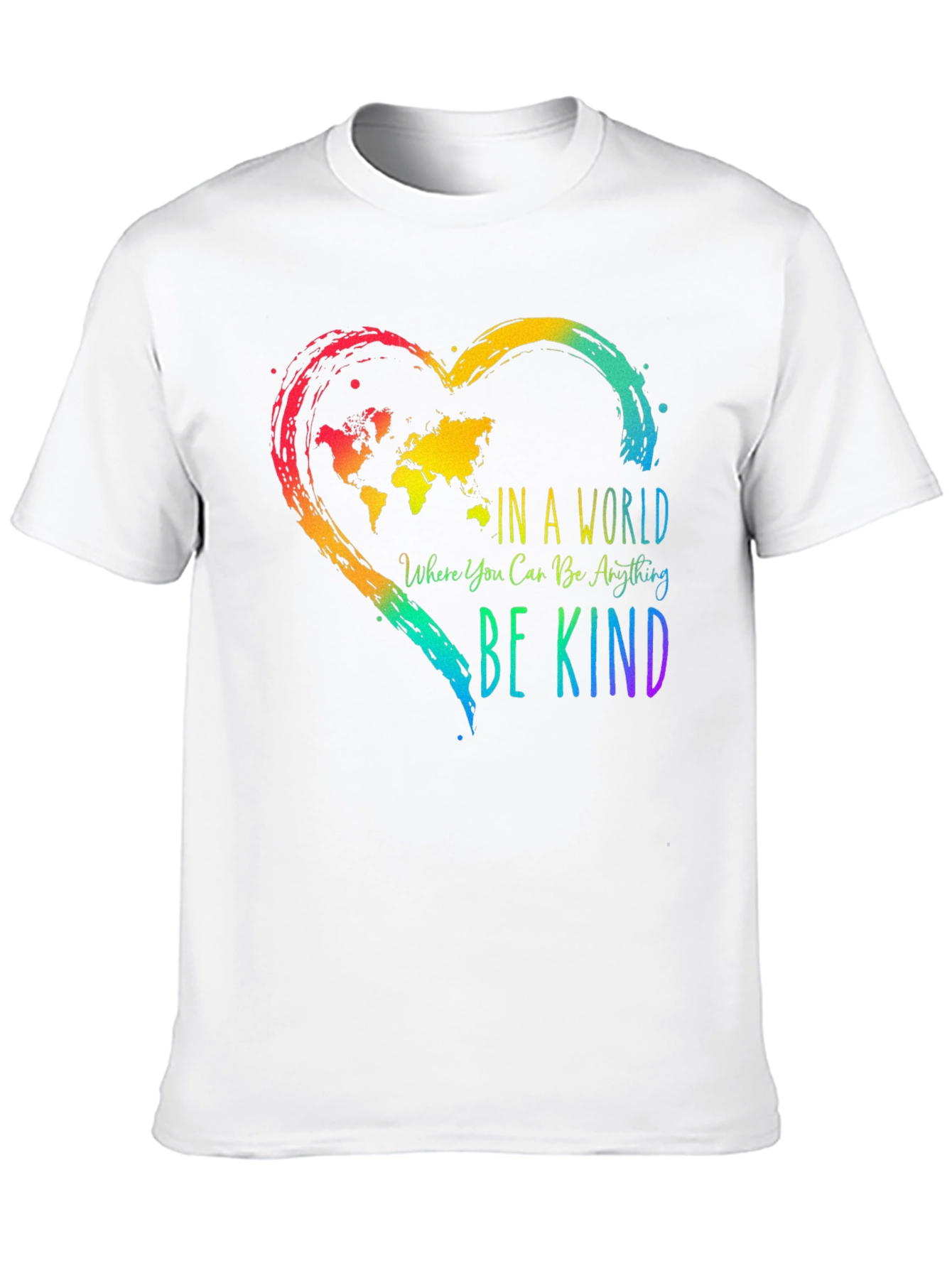 Show your support with this unique "In a World Where You Can Be Anything, Be Kind" black T-shirt. The tee features a colorful, eye-catching heart-shaped design filled with a world map, a reminder of unity and empathy. The rainbow gradient adds a touch of vibrancy and positivity to your wardrobe. Perfect for casual wear, social events, or as a thoughtful gift. Wear your values and spread kindness wherever you go with this inspiring T-shirt. The T-shirt itself appears to be made of a soft, comfortable material that makes this shirt ideal for everyday wear.