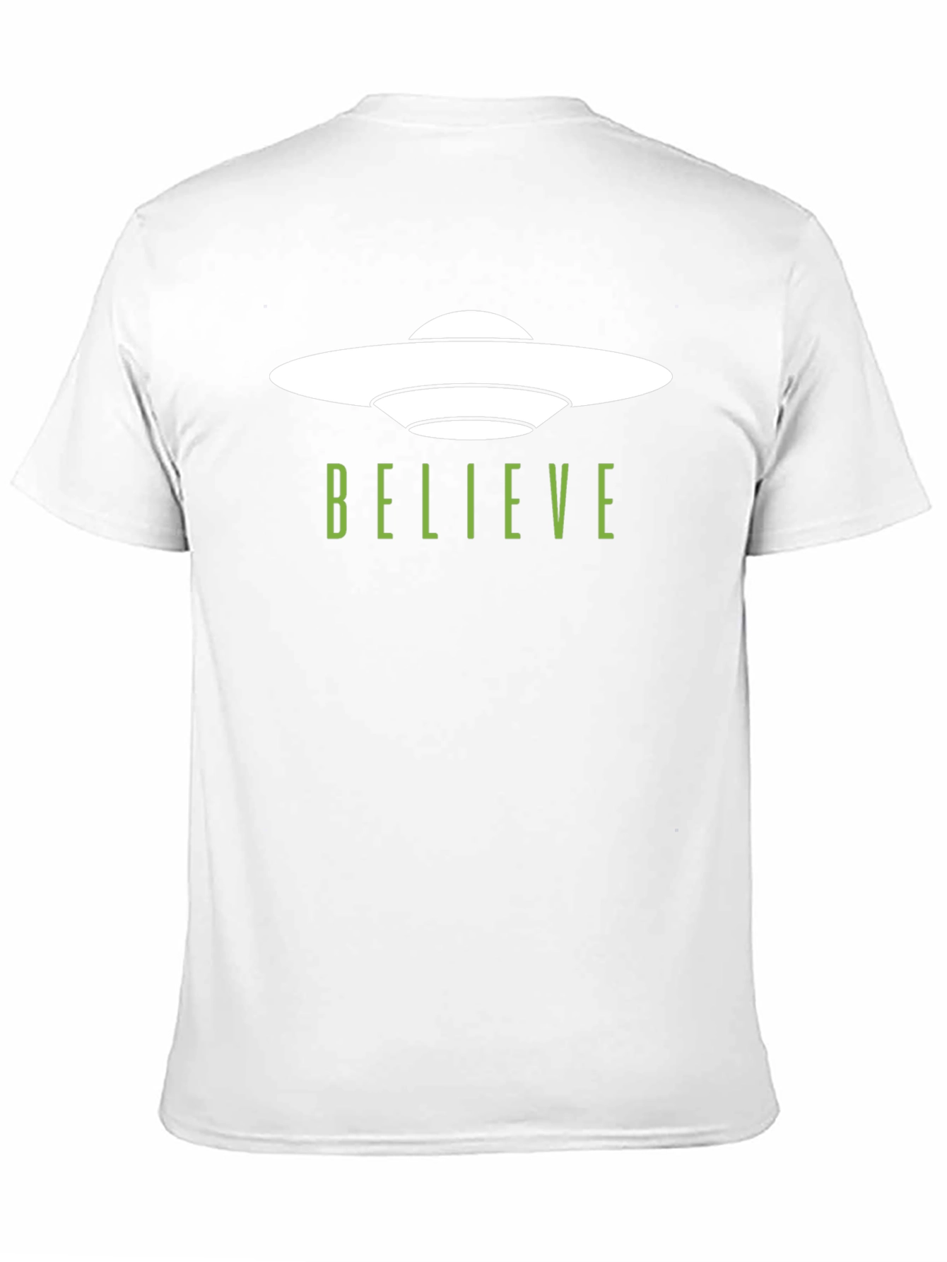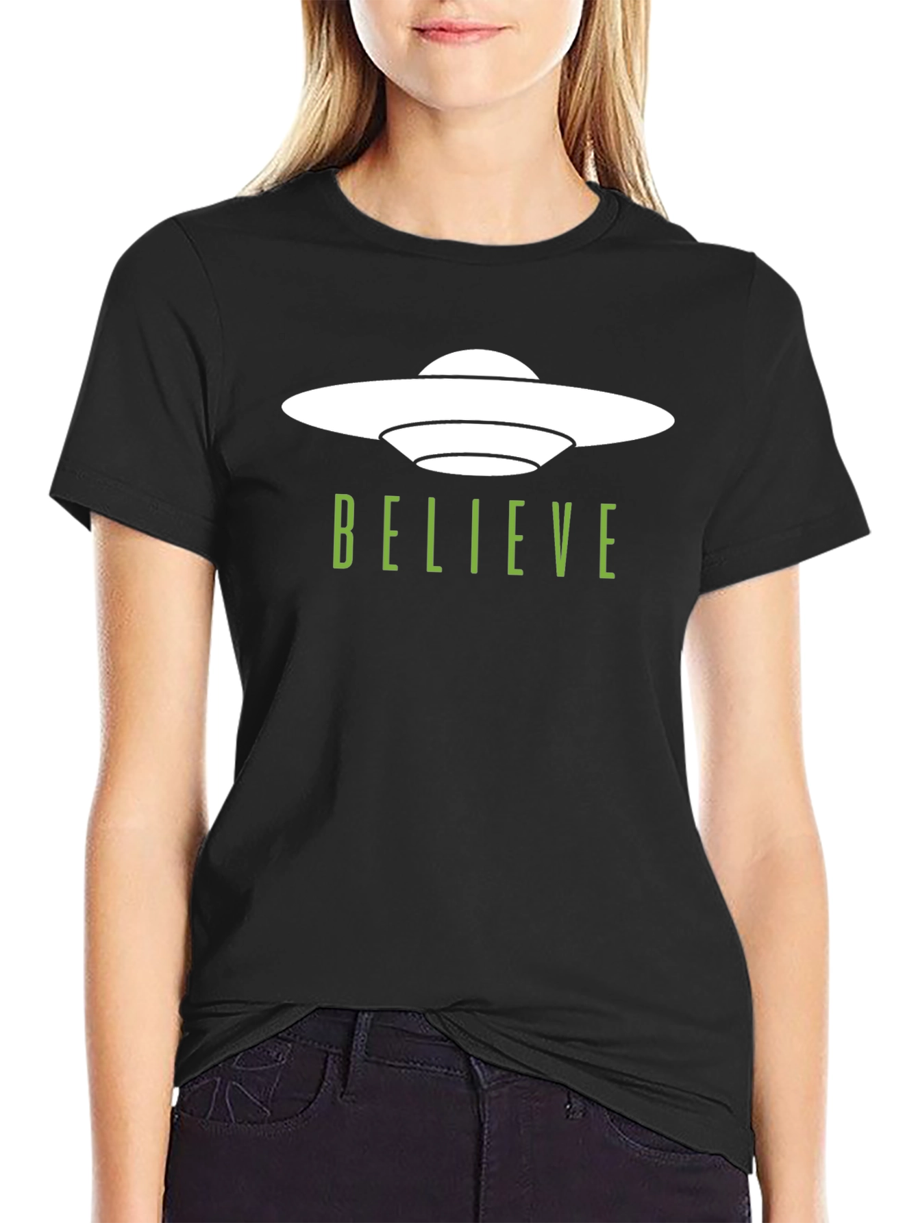 Show your belief in the extraordinary with this stylish black graphic tee! Featuring a clean, white UFO design above the word "BELIEVE" in vibrant green lettering, this t-shirt is sure to spark conversation. The shirt appears to be made from a soft and comfortable fabric, making it perfect for everyday wear. Its minimalist design makes it versatile for casual outings, sci-fi conventions, or just lounging around. Express your unique perspective with this eye-catching and comfortable tee. A must-have for anyone fascinated by extraterrestrial life and a touch of modern style. Get yours today!