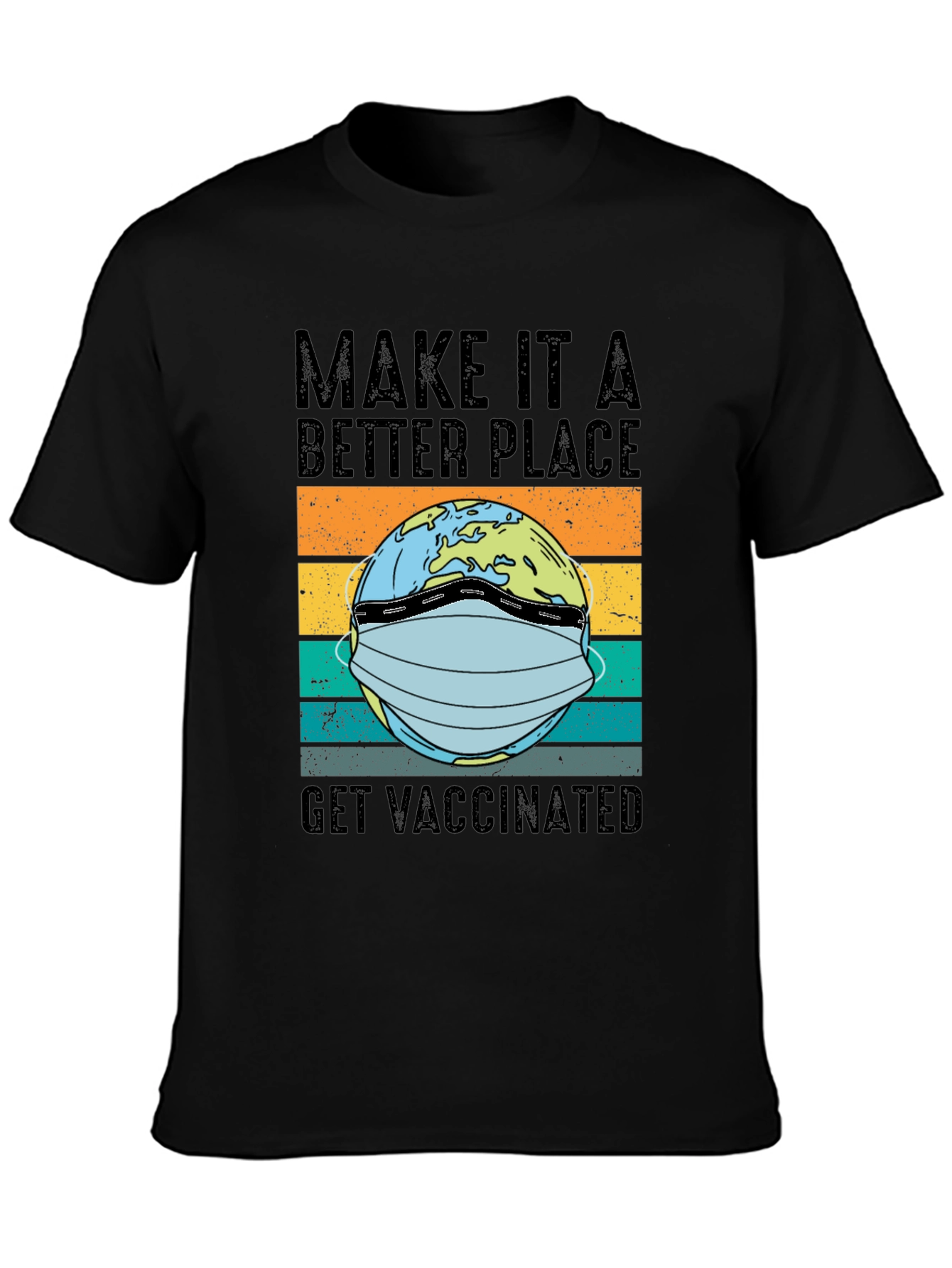 Show your support for global health with this unique t-shirt! Featuring a graphic of the Earth wearing a face mask against a retro-striped background, this tee encourages vaccination. The words "MAKE IT A BETTER PLACE" and "GET VACCINATED" appear above and below the Earth image in bold black text. The shirt is a classic black color and is made of a comfortable fabric, perfect for everyday wear. Ideal for advocates of public health and those who want to promote a responsible message. A stylish way to express your views and spark conversation.