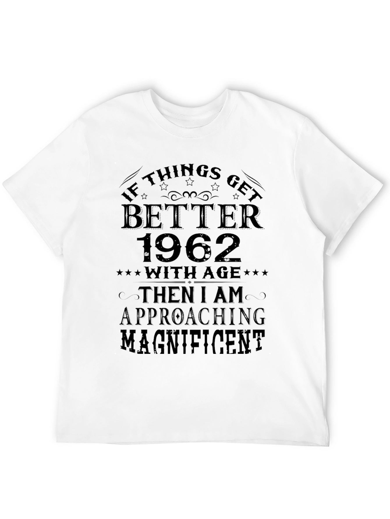 This black t-shirt features a playful and celebratory design, perfect for those embracing their age. The shirt prominently displays the phrase "IF THINGS GET BETTER 1962 WITH AGE THEN I AM APPROACHING MAGNIFICENT" in a vintage-inspired font. The dark print contrasts nicely against the black background. Made from a soft, comfortable fabric, this tee is ideal for casual wear. It's a fun way to showcase your birth year or a special milestone while adding a touch of humor to your wardrobe. Makes a great birthday gift for someone born in 1962. Wear it to parties, casual outings, or just lounging at home.
