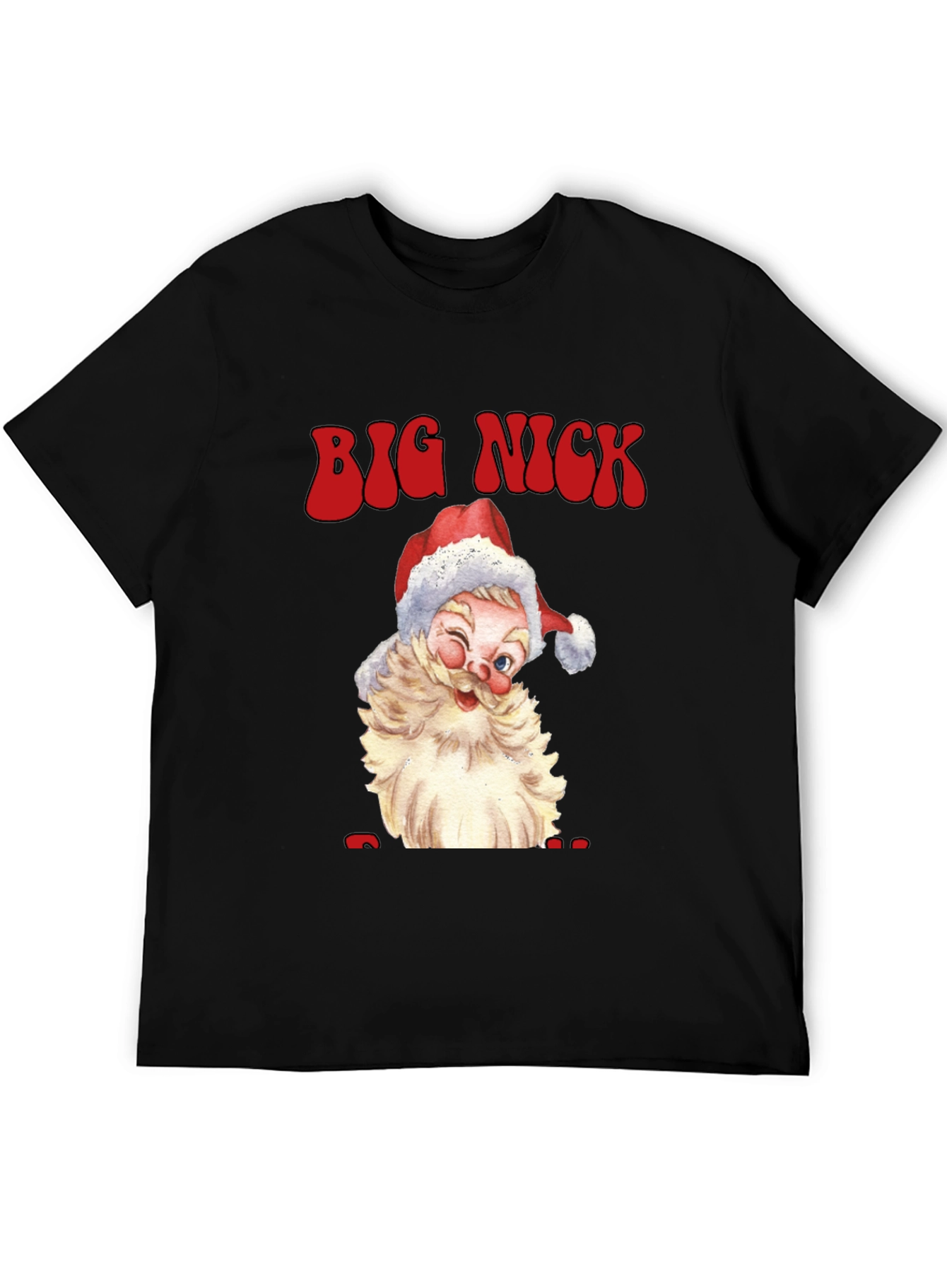 Spread some holiday cheer with this eye-catching black t-shirt featuring a winking Santa Claus graphic! The vintage-inspired design includes the playful text "Big Nick" in a groovy red font. Made from a comfortable-looking fabric, this tee is perfect for casual wear during the festive season. The bright and fun image on the shirt is sure to turn heads and bring a smile to anyone's face. Wear it to your next holiday party, family gathering, or just while lounging around the house spreading joy. A unique and quirky way to celebrate Christmas! Get ready to embrace the holiday spirit with this fun and festive t-shirt.