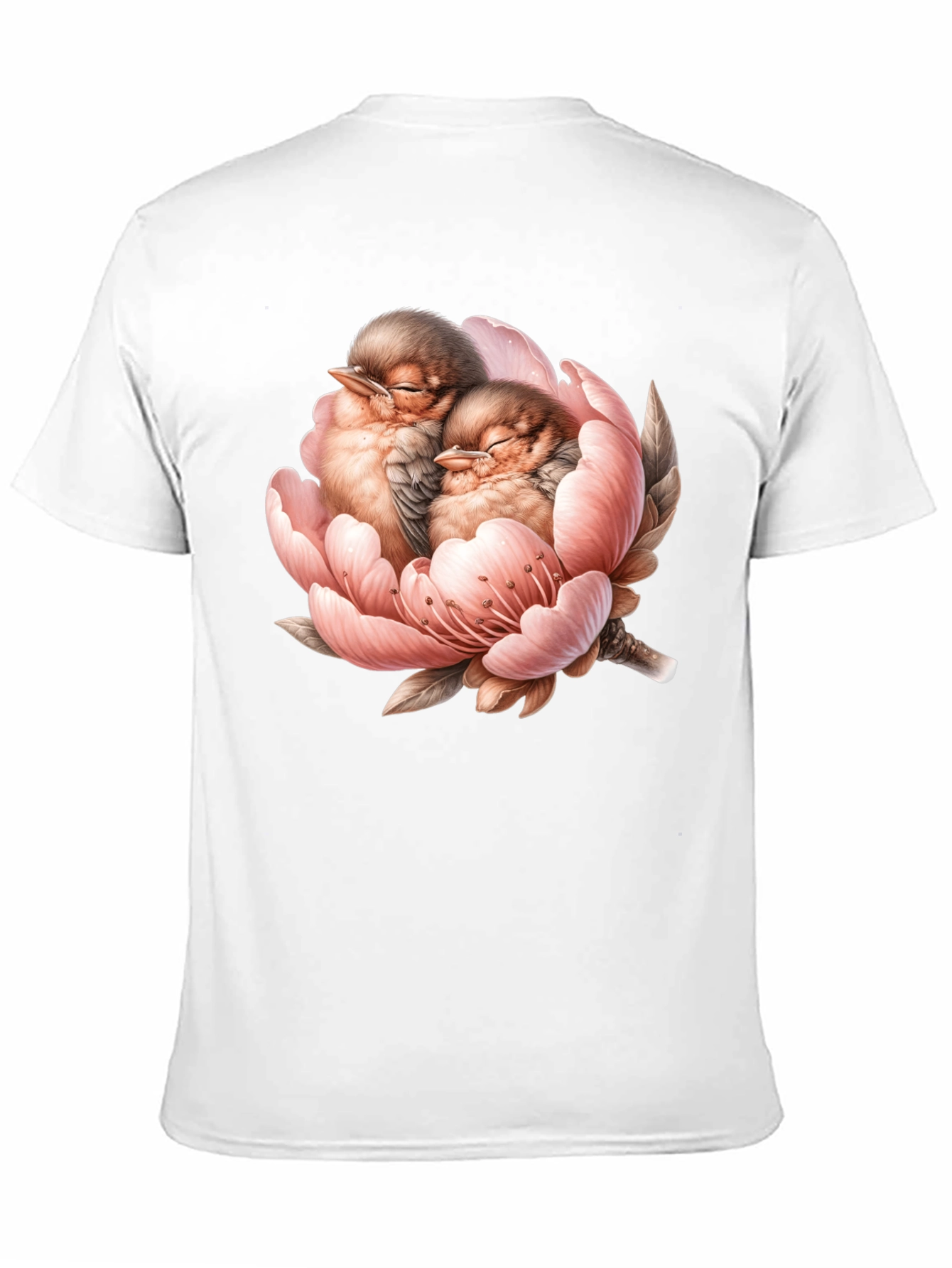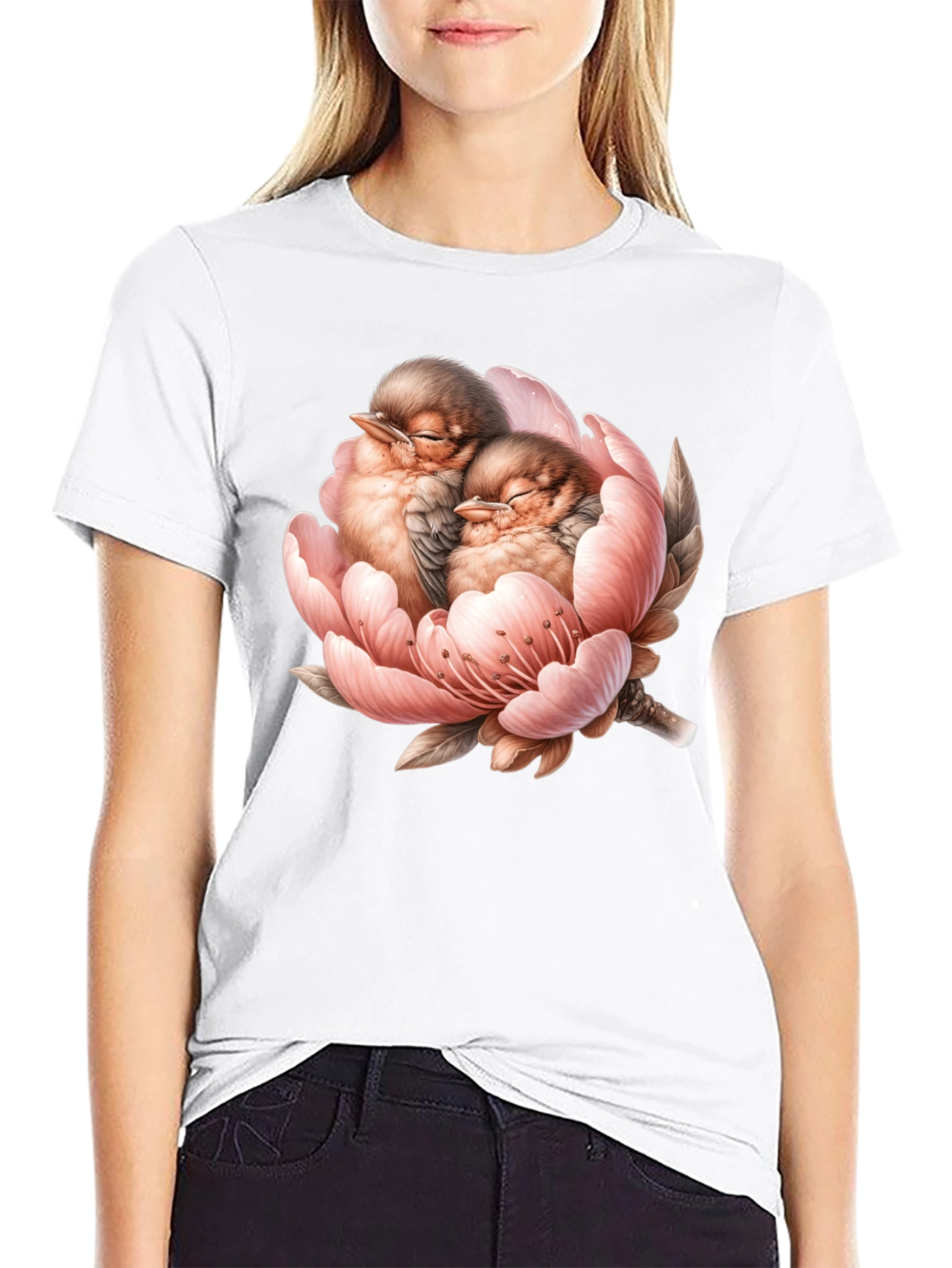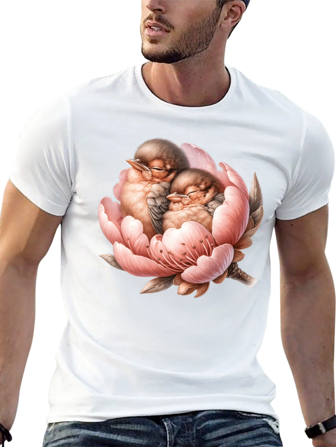 Embrace nature's beauty with this unique black graphic tee. The shirt features an adorable design of two small birds nestled inside a blooming pink flower. The artwork is vividly printed, creating a striking contrast against the black background. Made from a soft, comfortable fabric, this tee is perfect for everyday wear. Show off your love for wildlife and stand out from the crowd with this eye-catching piece. Pair it with jeans for a casual look or dress it up with a skirt for a more fashionable style. A great gift for bird lovers!